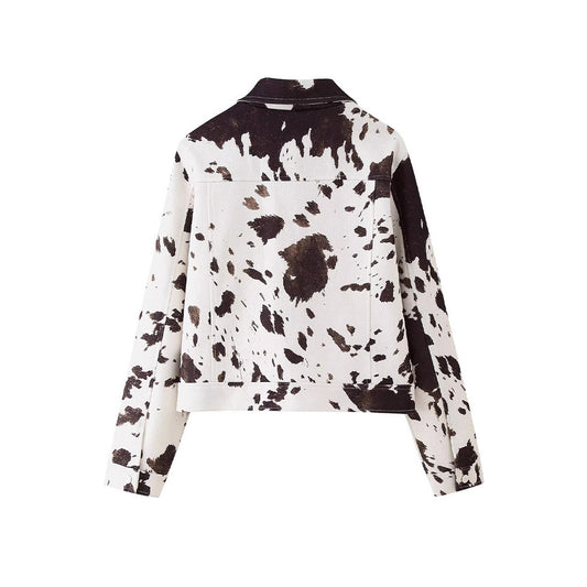 Damen Jeansjacke mit leuchtendem Kuhfell-Design und klassischen Pattentaschen Fudus