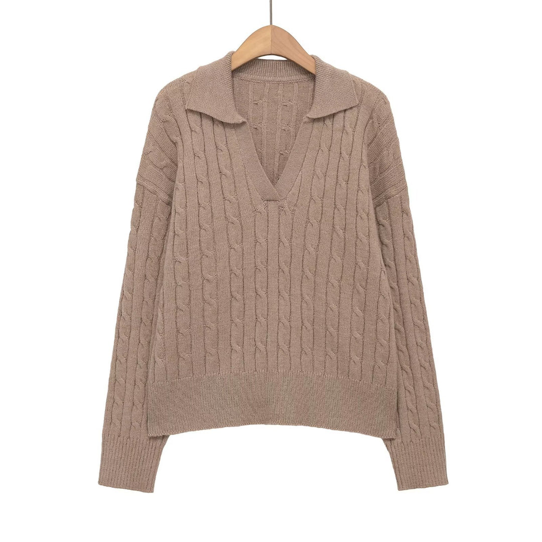 Damen Grobstrick Pullover mit V-Ausschnitt und Reverskragen Fudus