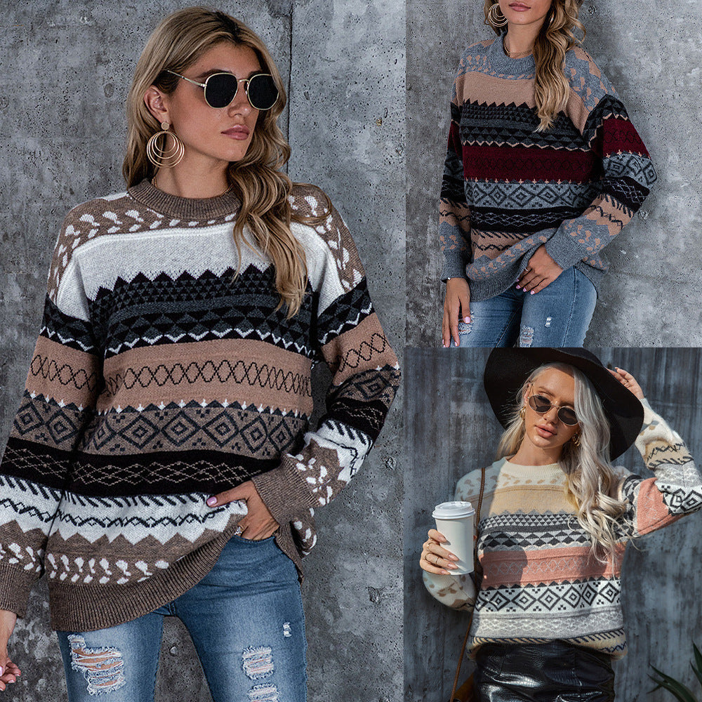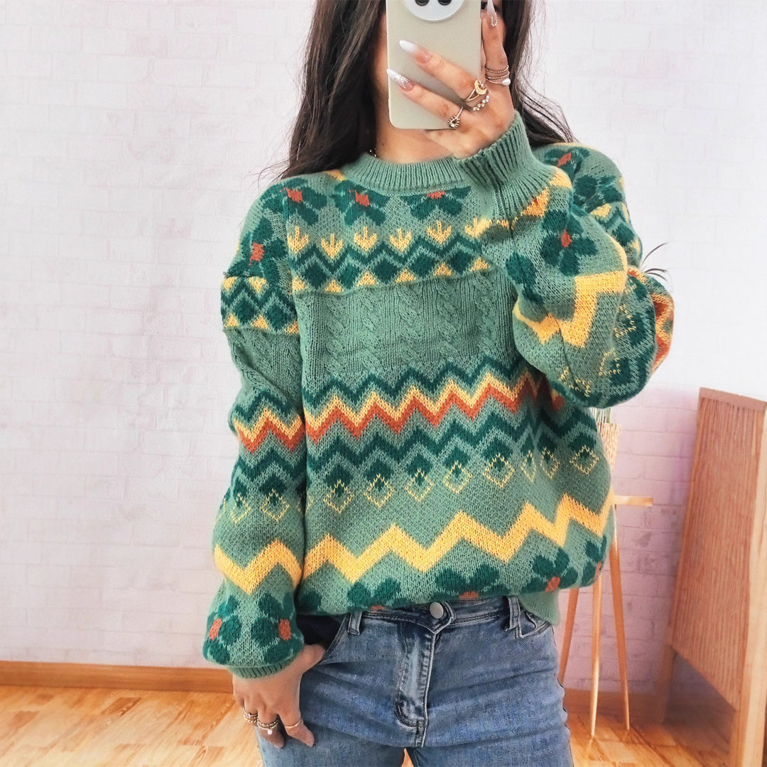 Damen Grobstrickpullover mit buntem Zickzackmuster und floralen Akzenten Fudus