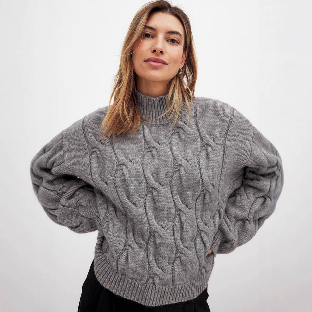 Damen Grobstrickpullover mit einem hohen Kragen und romantischem Zopfdesign Fudus