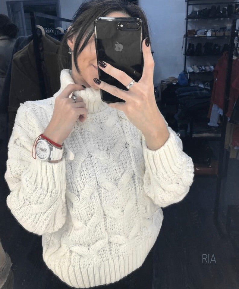 Damen Grobstrickpullover mit hohem Kragen und elegantem Zopfmuster Fudus