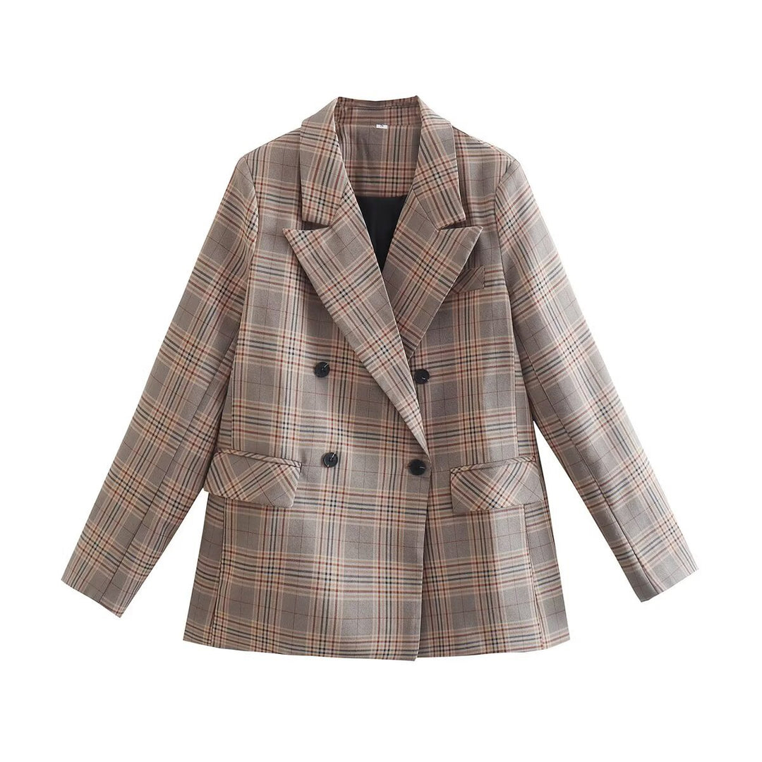 Damen karierte Blazerjacke mit doppelter Knopfleiste und aufgesetzten Taschen Fudus