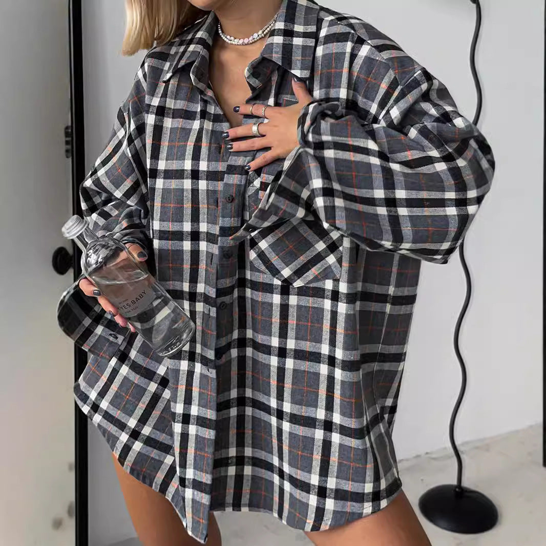 Damen Karierte Hemdblusenshirt mit längerem Schnitt Fudus