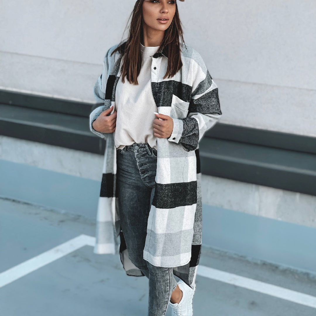 Damen Karierte Langjacke aus hochwertigem Stoff mit Knopfleiste Fudus