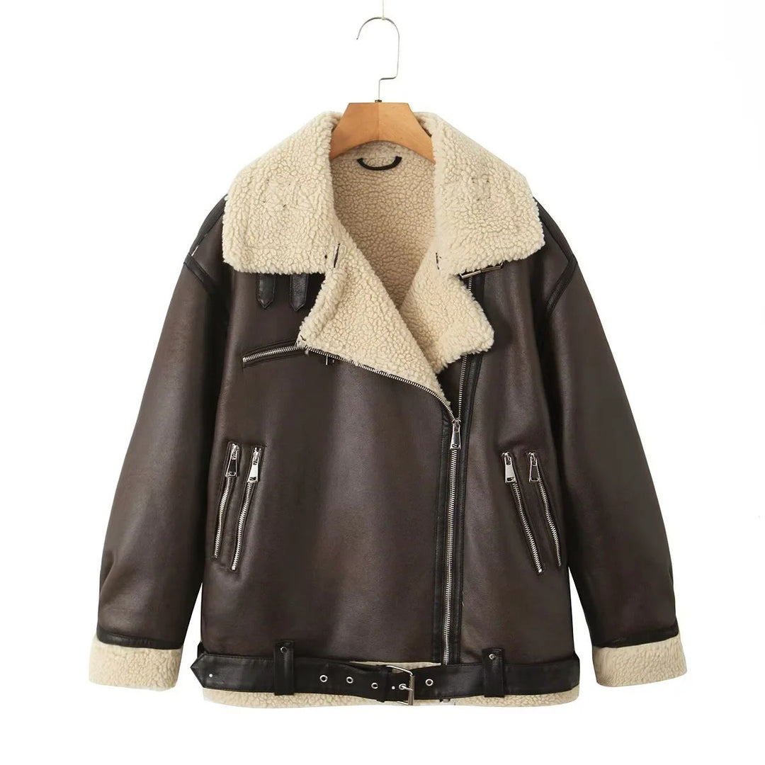 Damen Kunstfelljacke mit seitlichen Reißverschlusstaschen und Gürtel Fudus
