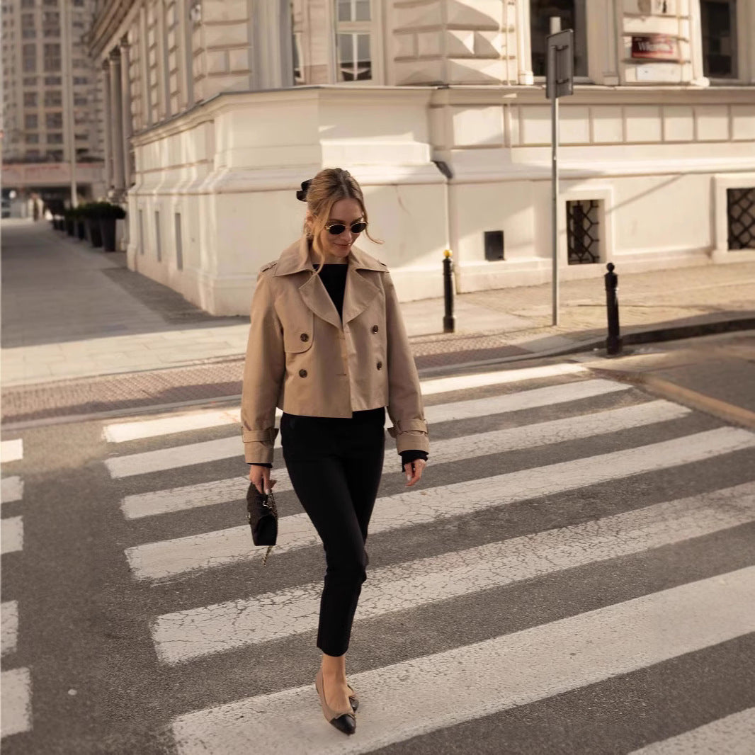 Damen kurze Trenchjacke mit Gürtel und doppelter Knopfleiste Fudus