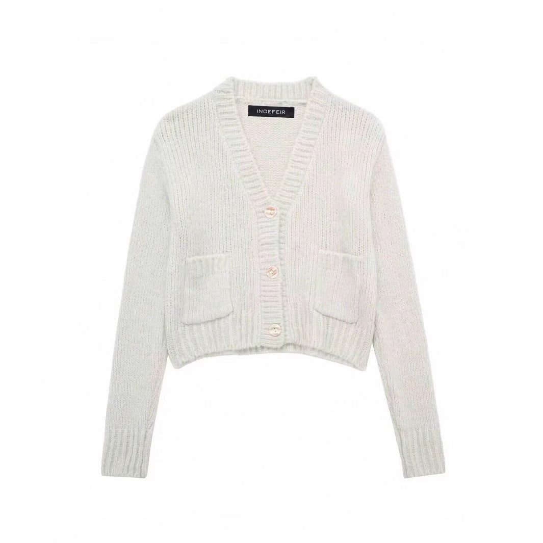 Damen kuschelige Strickjacke mit tiefem V-Ausschnitt und praktischen Taschen Fudus
