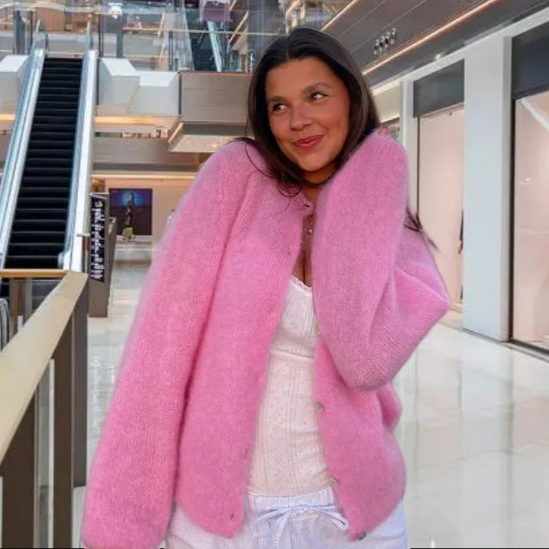 Damen kuschelige Strickjacke mit V-Ausschnitt und Knopfverschluss Fudus