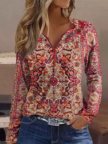 Damen Langarm-T-Shirt mit lässigem V-Ausschnitt und buntem Motiv Fudus