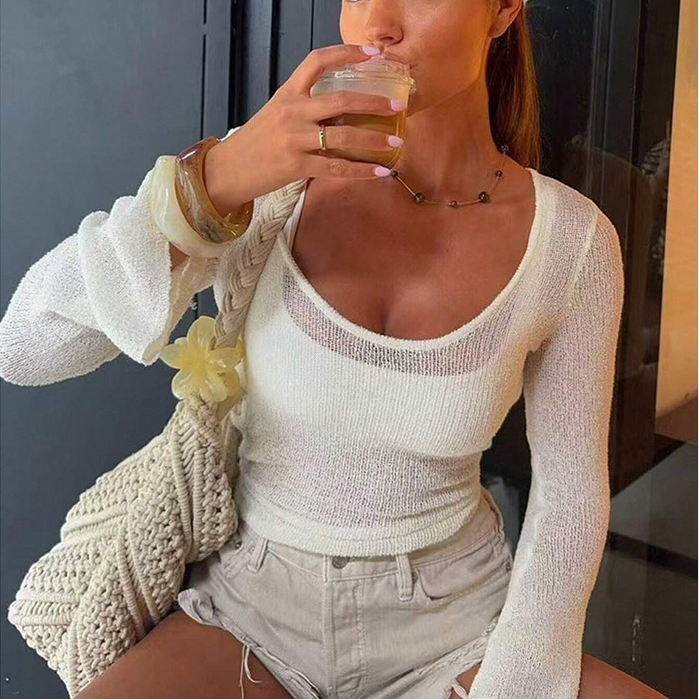 Damen langärmliges Oberteil mit eleganter U-Ausschnitt-Details Fudus