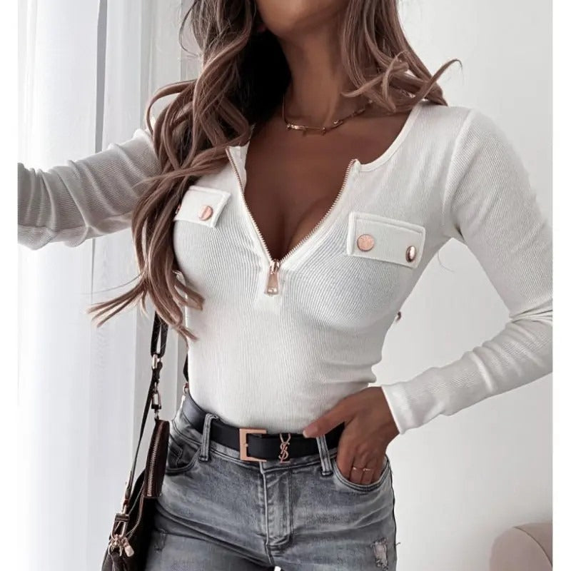 Damen Langärmliges Oberteil mit Zipper und Brusttaschen Fudus