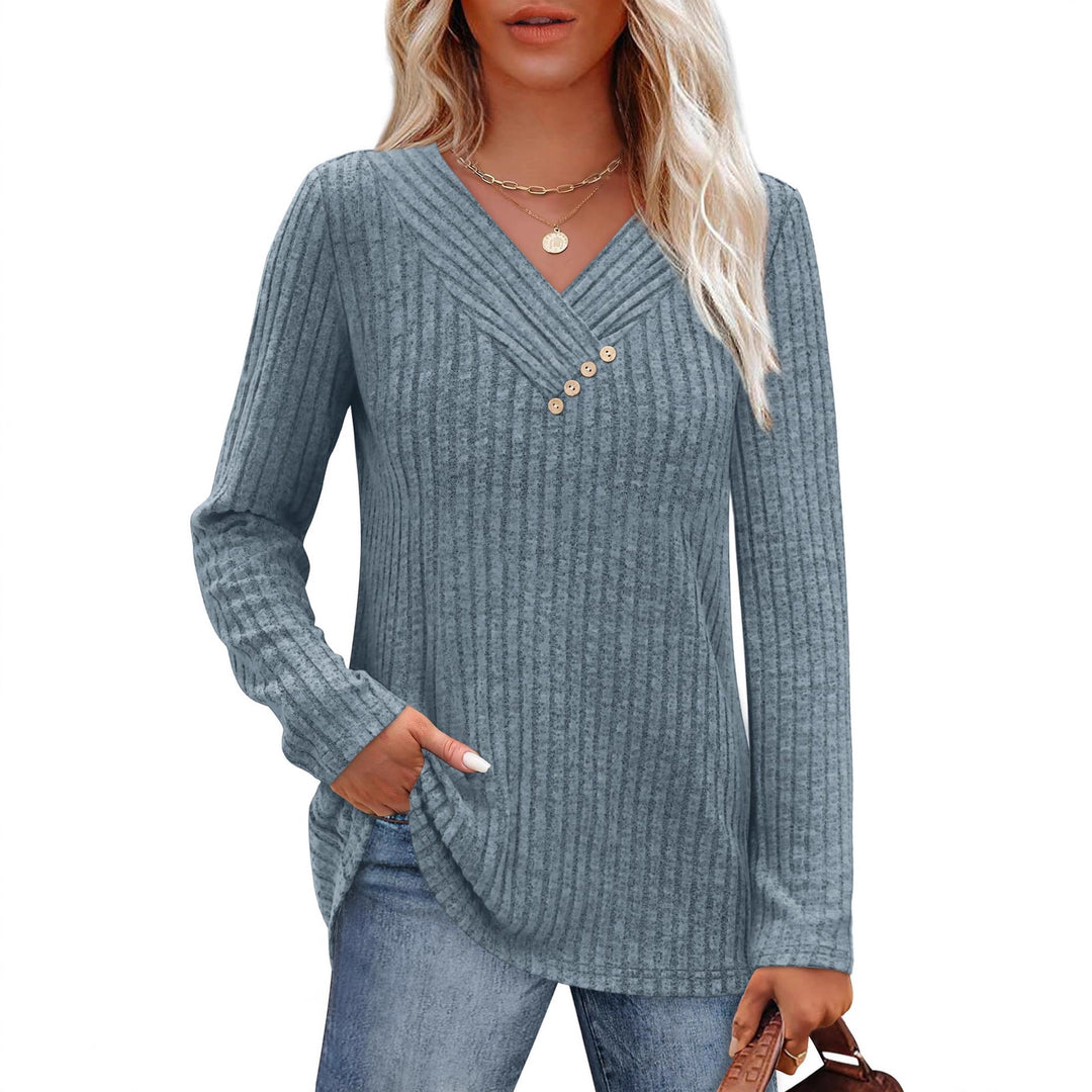 Damen Langärmliges V-Ausschnitt Shirt mit Knopfdetails Fudus