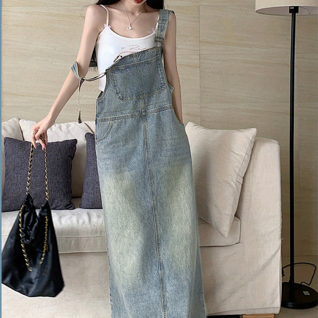 Damen Langer Denim-Overall mit Verstellbaren Trägern & Tiefen Taschen