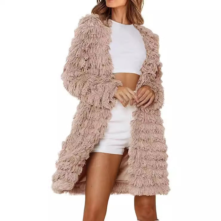 Damen Langer Flauschiger Cardigan mit offenem Schnitt und überschnittenen Ärmeln Fudus