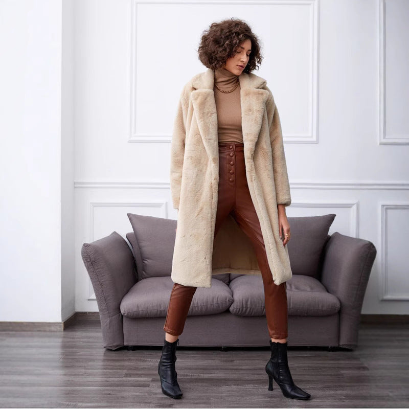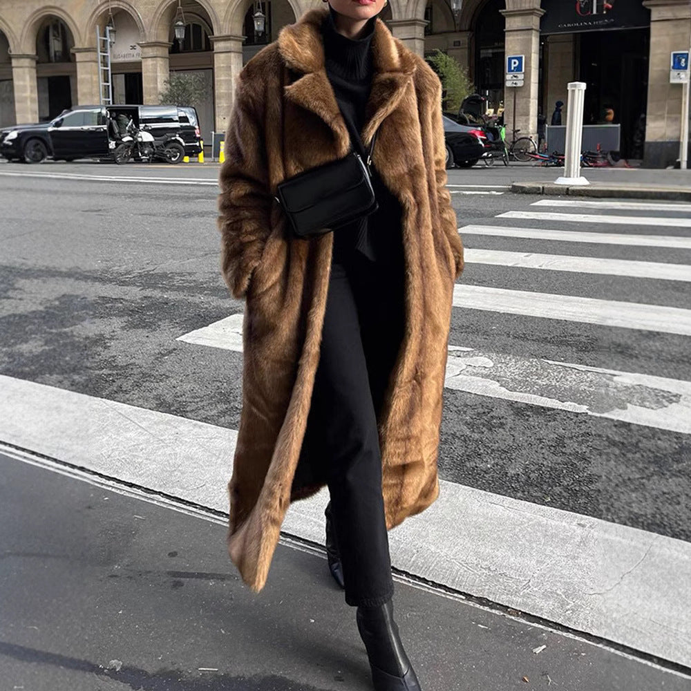 Damen Langer Kunstfellmantel mit breitem Revers und lässigem Schnitt Fudus