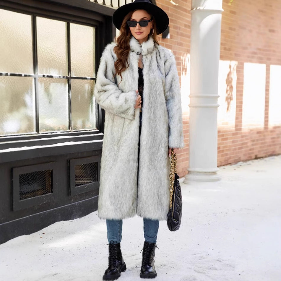 Damen Langer Kunstpelzmantel mit Stehkragen und Taschen Fudus