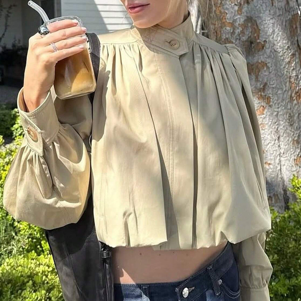Damen lässige Bluse mit hochgeschlossenem Kragen und voluminösen Ärmeln Fudus
