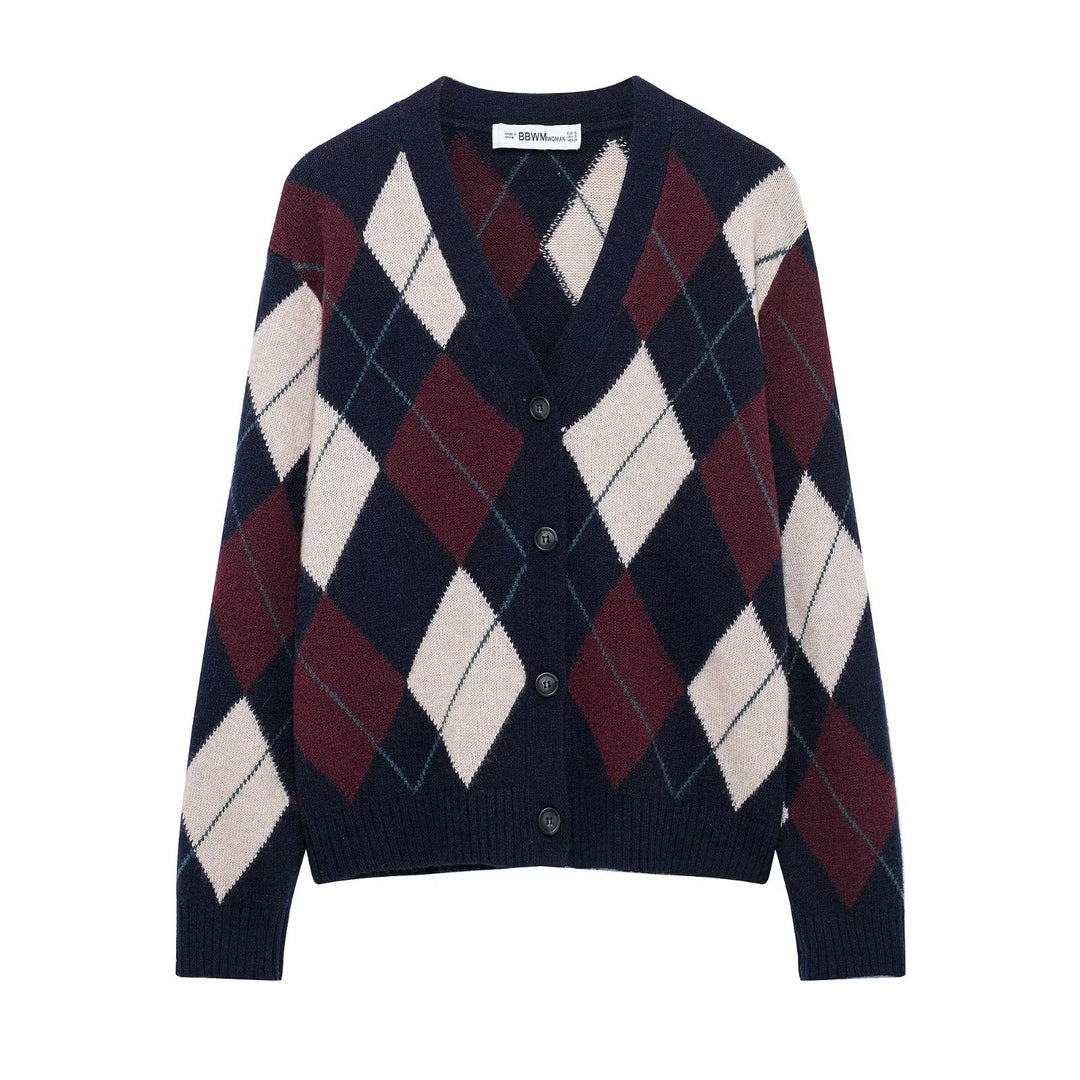 Damen lässige Strickjacke im Rauten-Muster mit goldenen Knöpfen Fudus