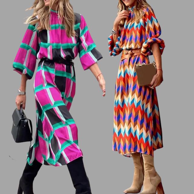 Damen Midikleid Fischgrätenmuster Bunt Gürtel Einzigartig