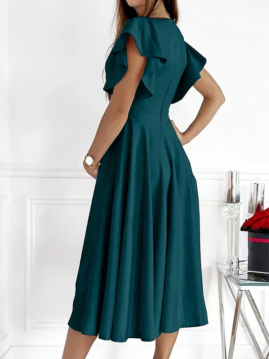 Damen Blaugrüne Midi Kleid mit Volant Ärmeln