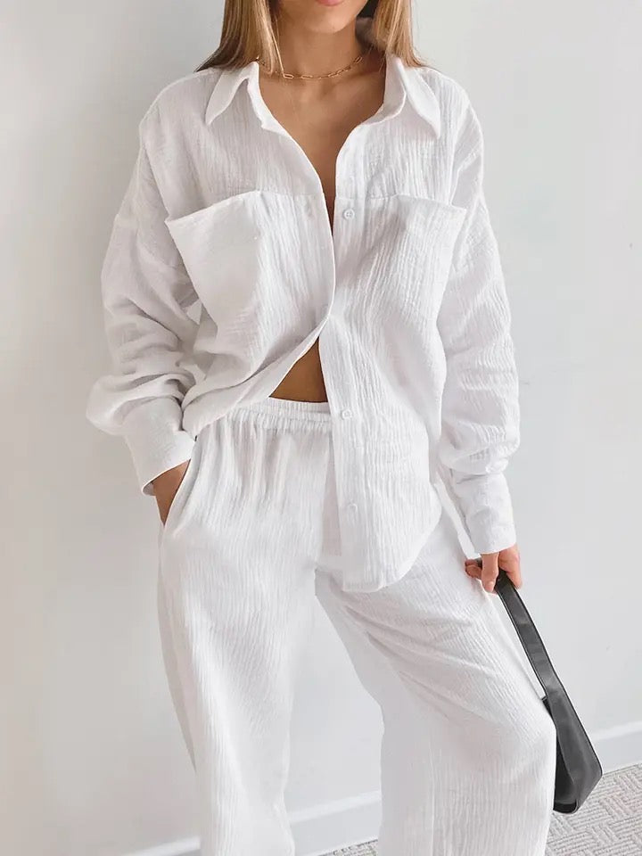 Damen Leinen Set Überlappendes Top Weite Hosenbeine