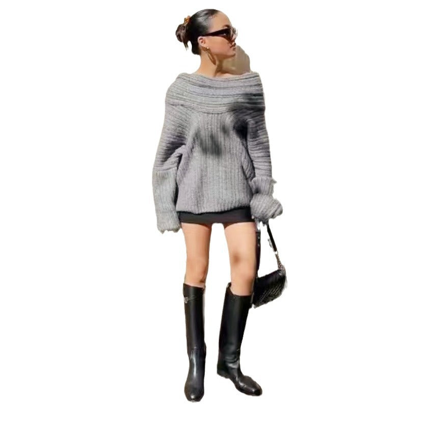 Damen grobstrickiger Pullover mit offener Schulter und lässigem Schnitt Fudus