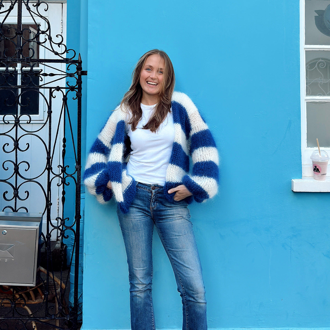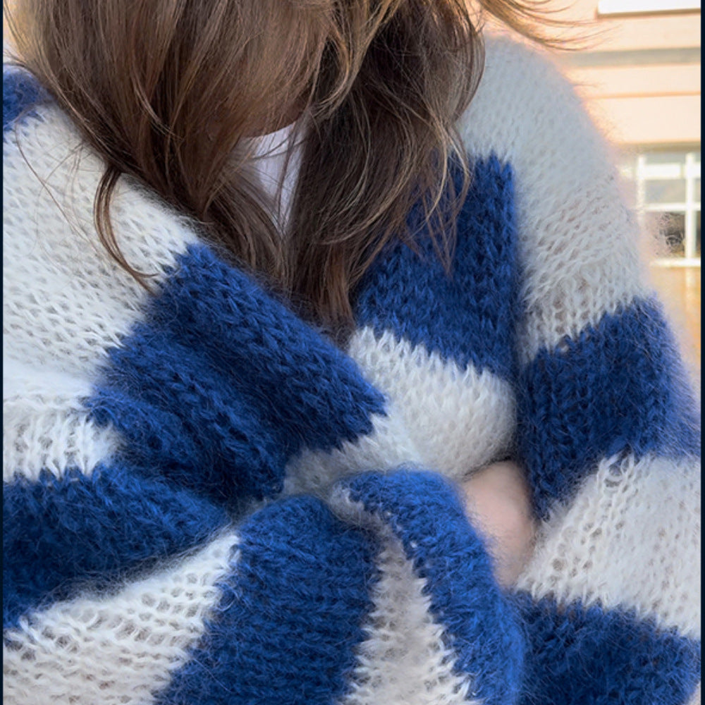 - Design: Das auffällige Streifenmuster in Blau und Weiß sorgt für einen frischen Look, während die weiten Ärmel Trends setzen.