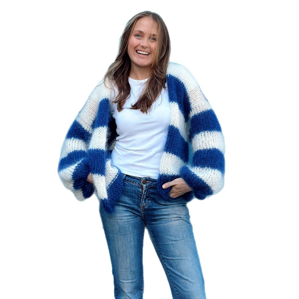 Damen Grobstrickjacke mit modischem Streifenmuster und weiten Ärmeln Fudus