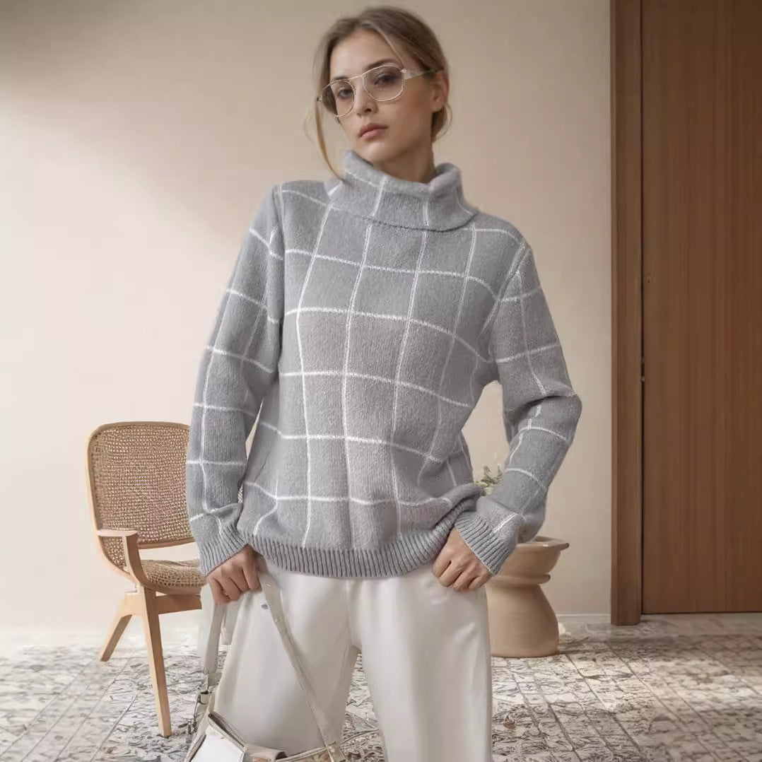 Damen Grobstrickpullover mit modernem Karomuster und hohem Kragen Fudus