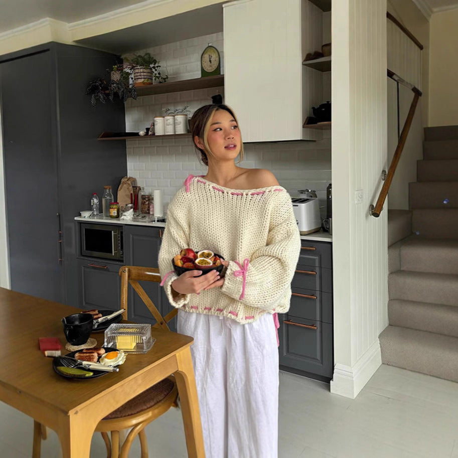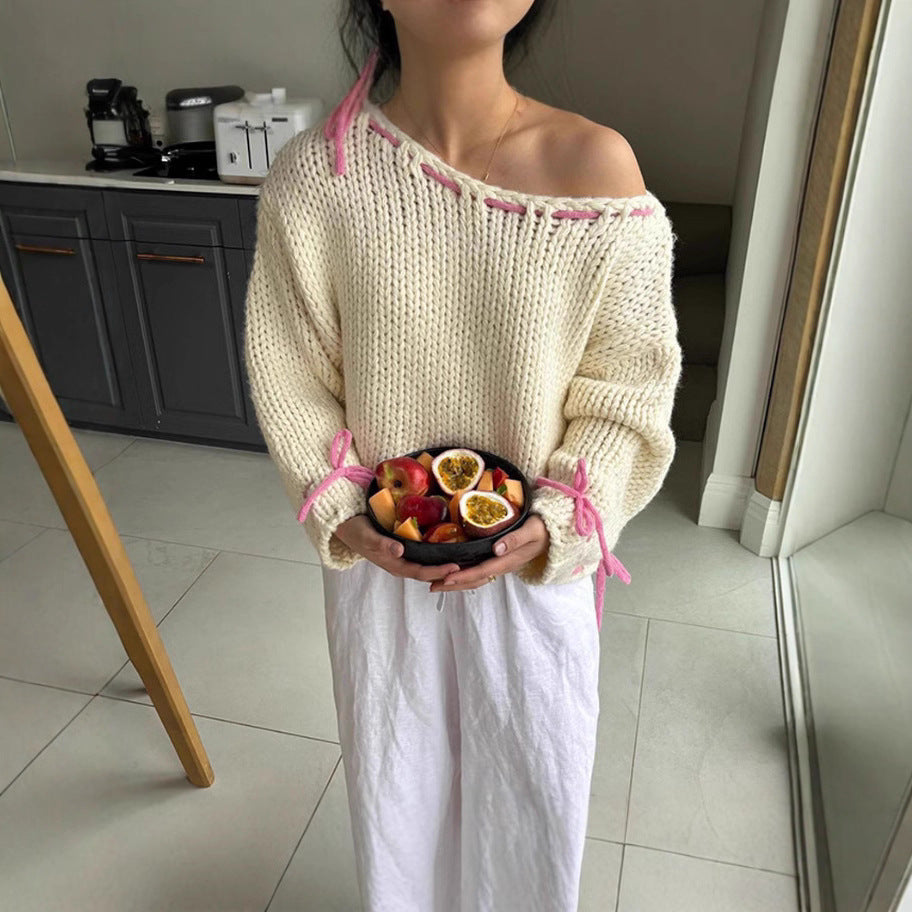 Damen Grobstrickpullover mit verspielten Schleifendetails Fudus