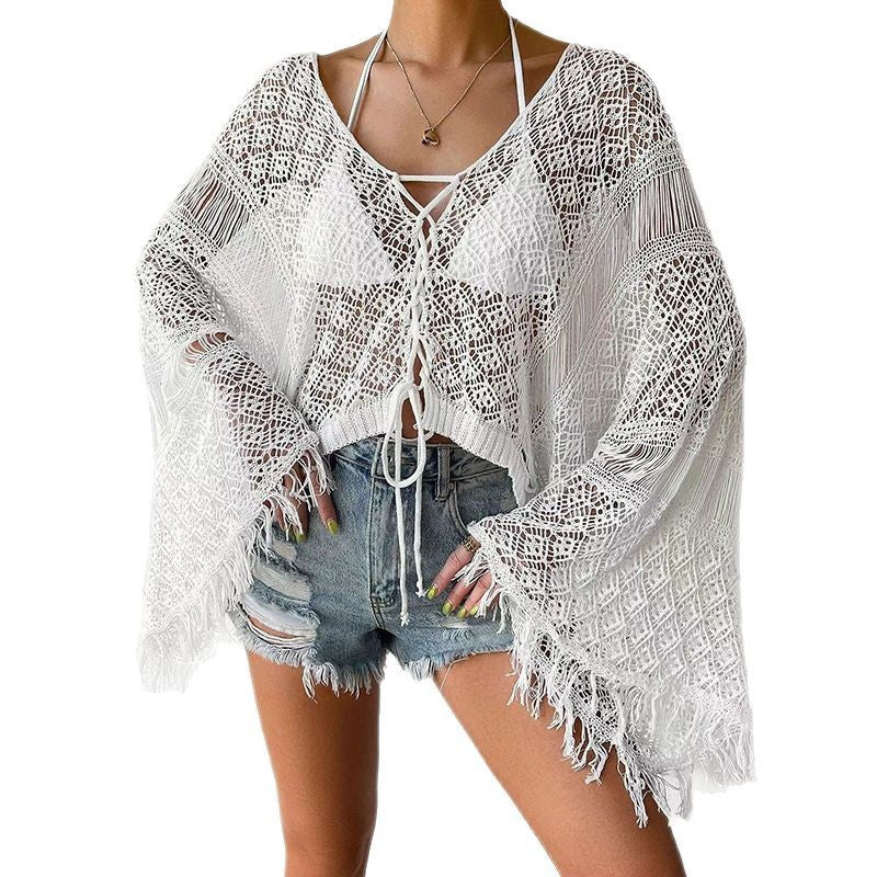 - Elegantes Design: Der V-Ausschnitt und die großzügigen, gefransten Ärmel verleihen dieser Strandrobe eine feminine Note.