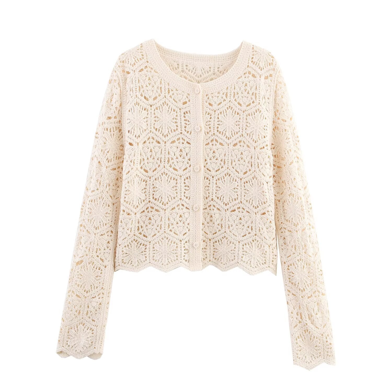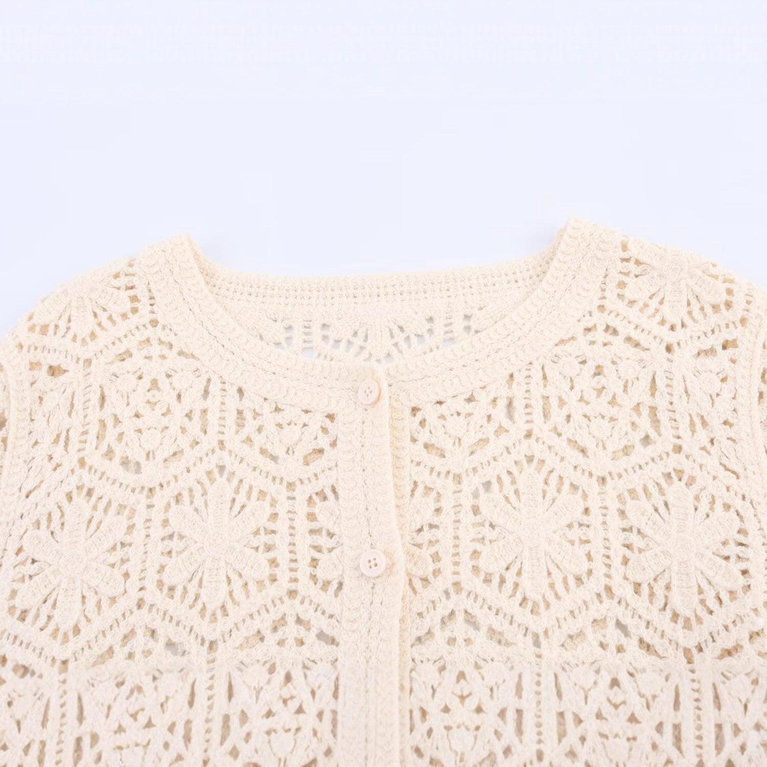 Damen Häkeljacke mit floralen Mustern und Knopfdesign Fudus