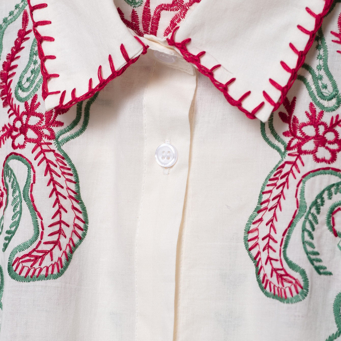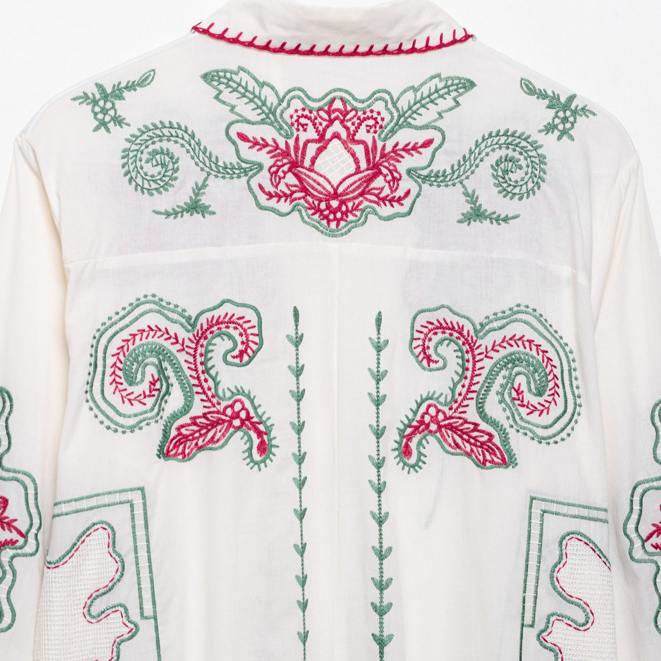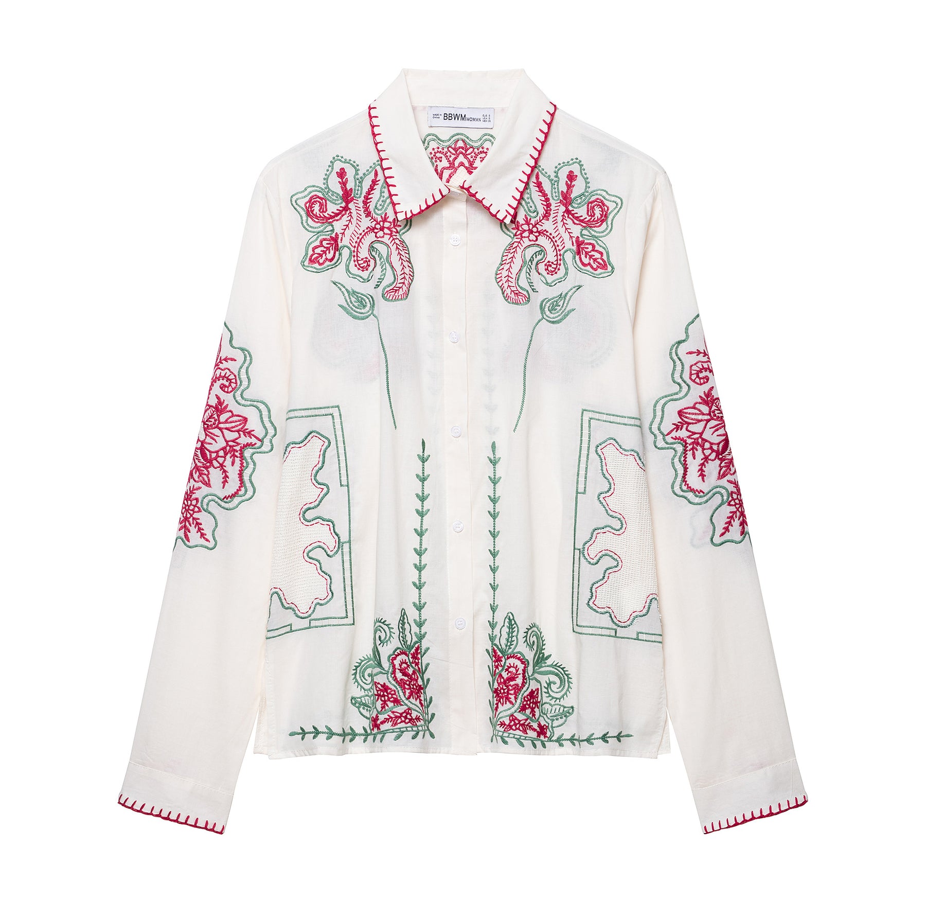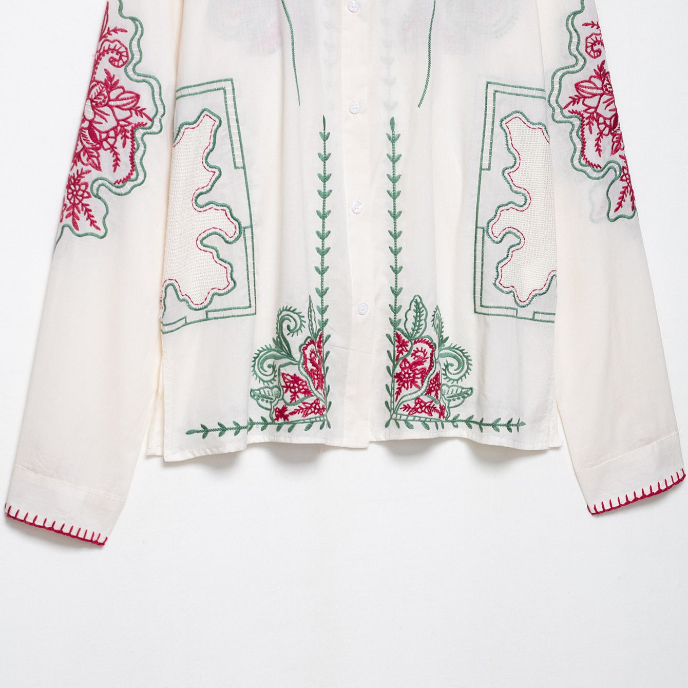 • Detailreiche Stickereien: Die Bluse ist mit aufwendigen floralen Mustern verziert, die einen harmonischen Kontrast zu dem schlichten Hintergrund bieten und jedem Outfit einen Hauch von Romantik verleihen.