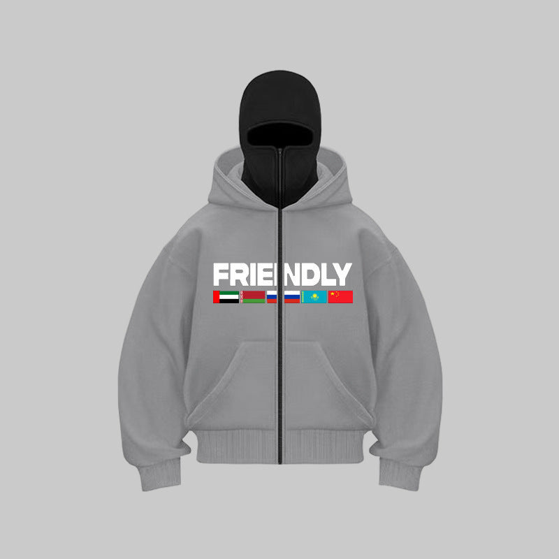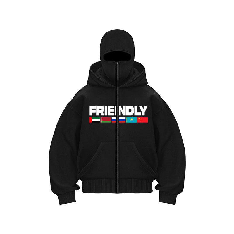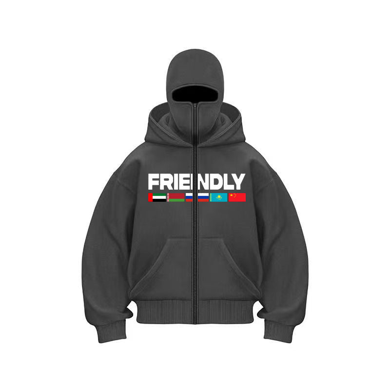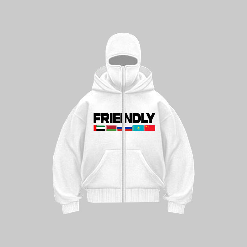 • Auffälliger Druck: Mit dem markanten Schriftzug "FRIENDLY" und internationalen Flaggen entsteht ein einzigartiger Look, der die Zuneigung zur Globalisierung ausdrückt.