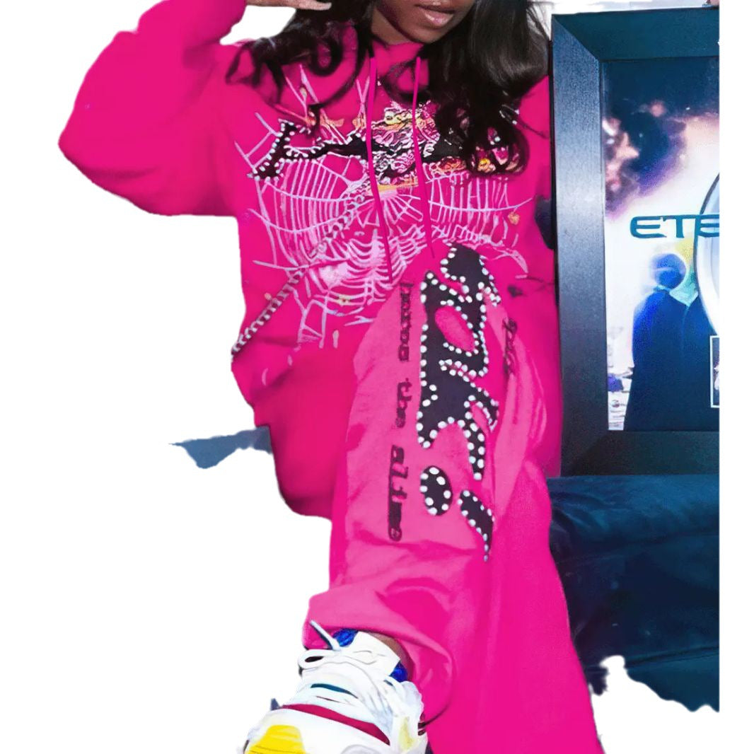 Entdecken Sie unser trendiges Damen Kapuzenset, das stilvolle Mode mit Komfort vereint. Dieses Set besteht aus einem gemütlichen Kapuzenpullover und einer passenden Jogginghose, die ideal für lässige Tage oder entspannte Abende sind. Der auffällige Spinnennetz-Druck verleiht dem Outfit eine kreative Note, während die leuchtende Farbe garantiert alle Blicke auf sich zieht.