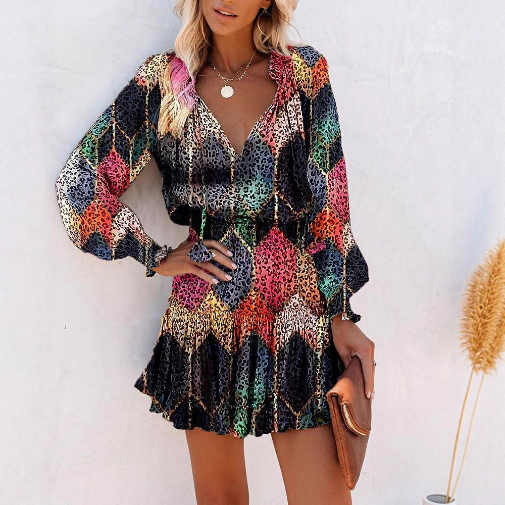 Damen Kleid mit V-Ausschnitt und voluminösen Ärmeln Fudus