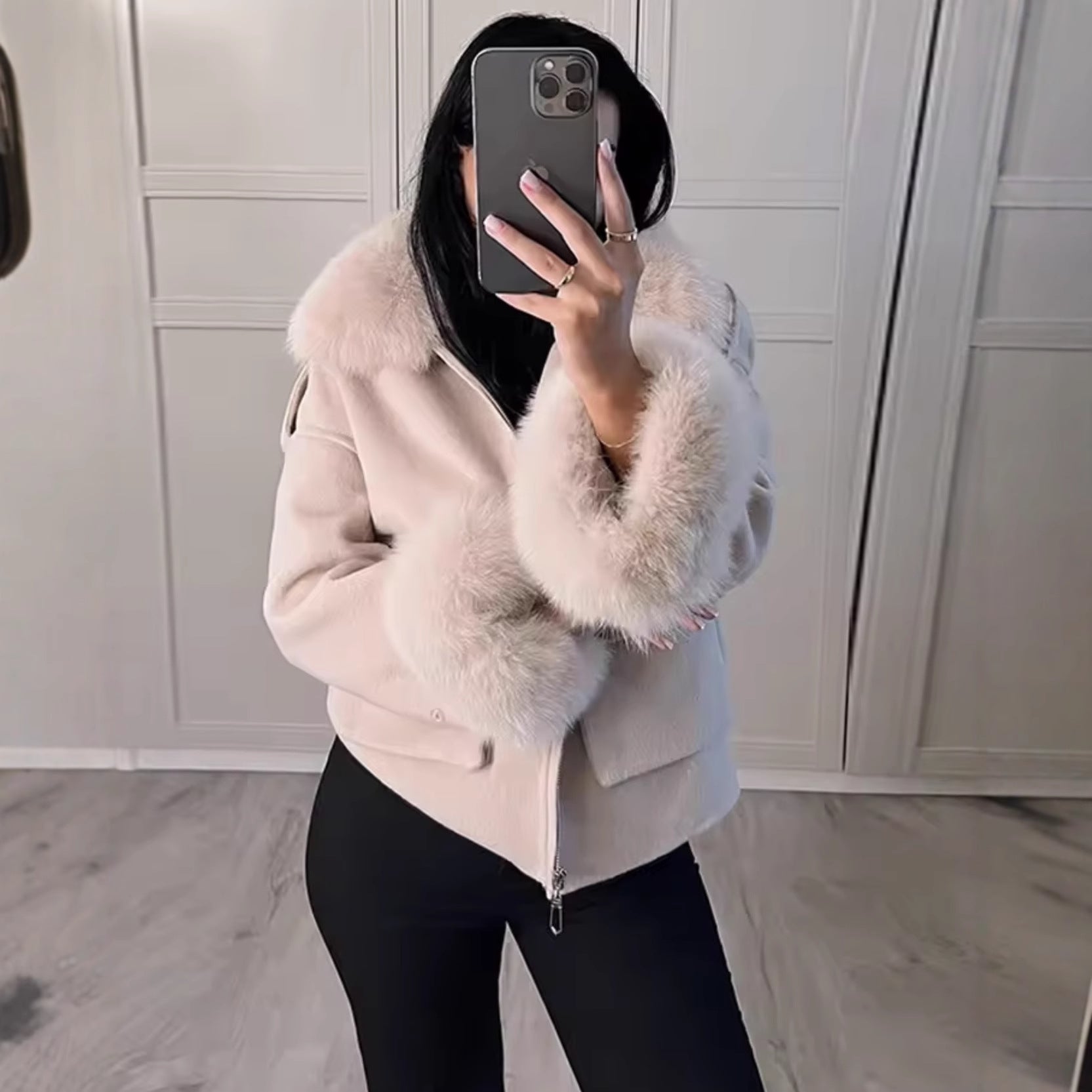 Damen Kunstfelljacke mit Pelzkragen und praktischen Taschen Fudus