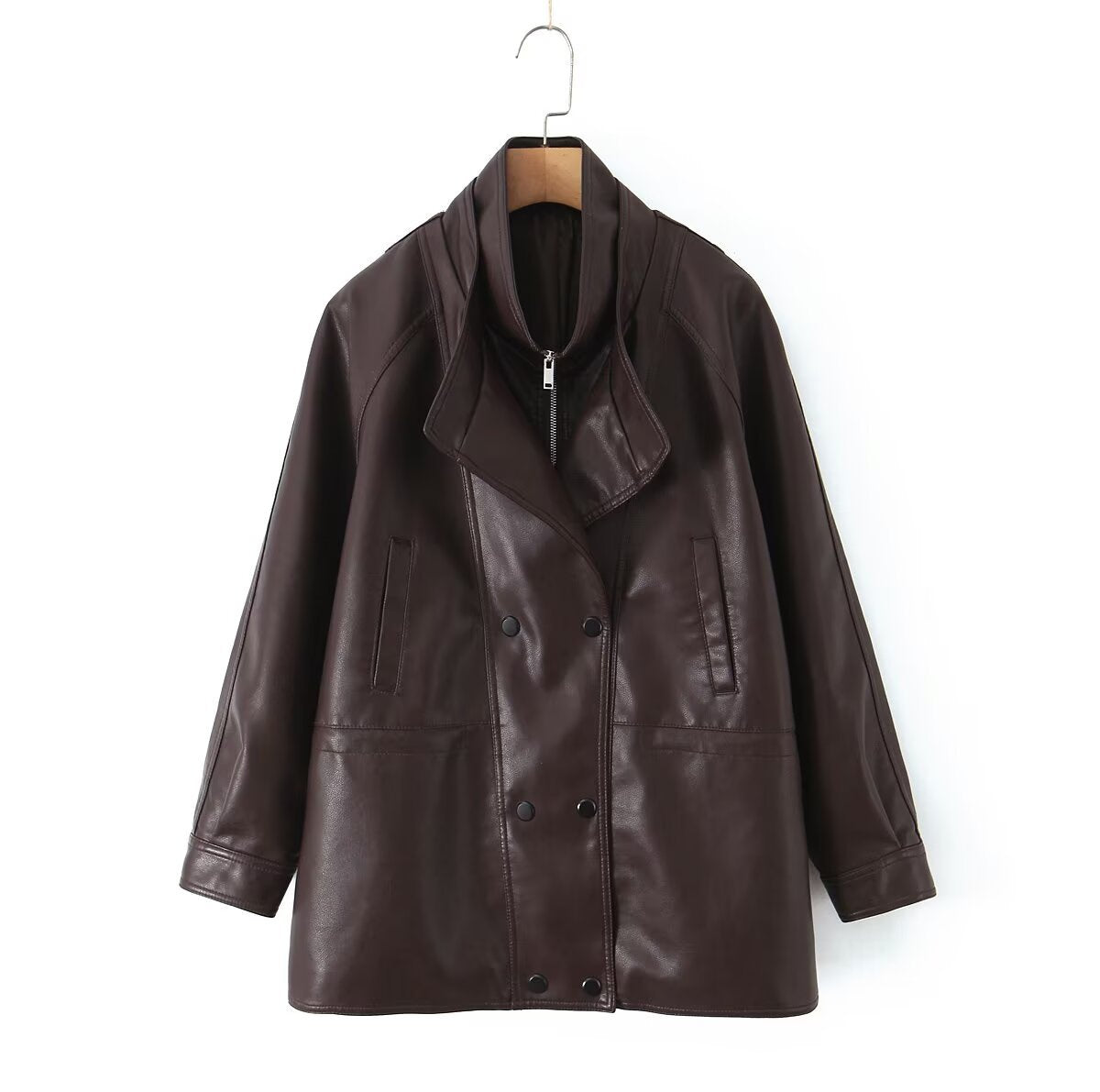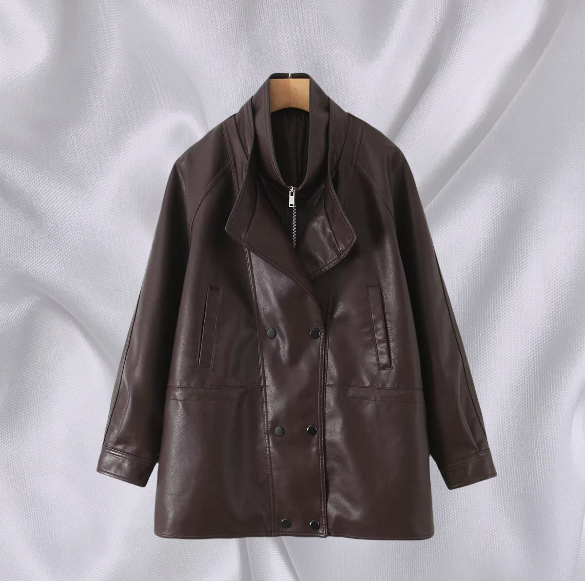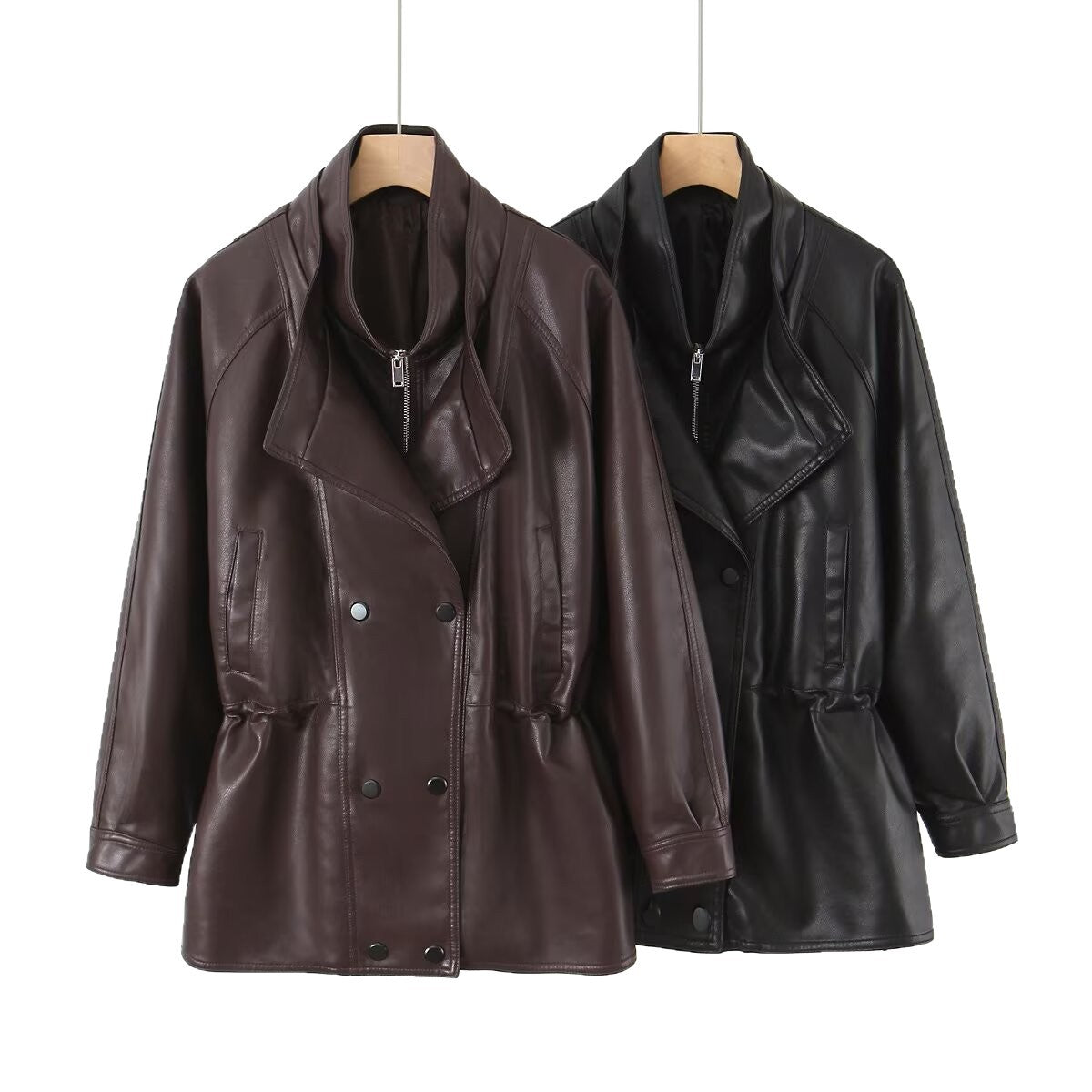 Damen Kunstlederjacke mit breitem Revers und praktischen Taschen Fudus