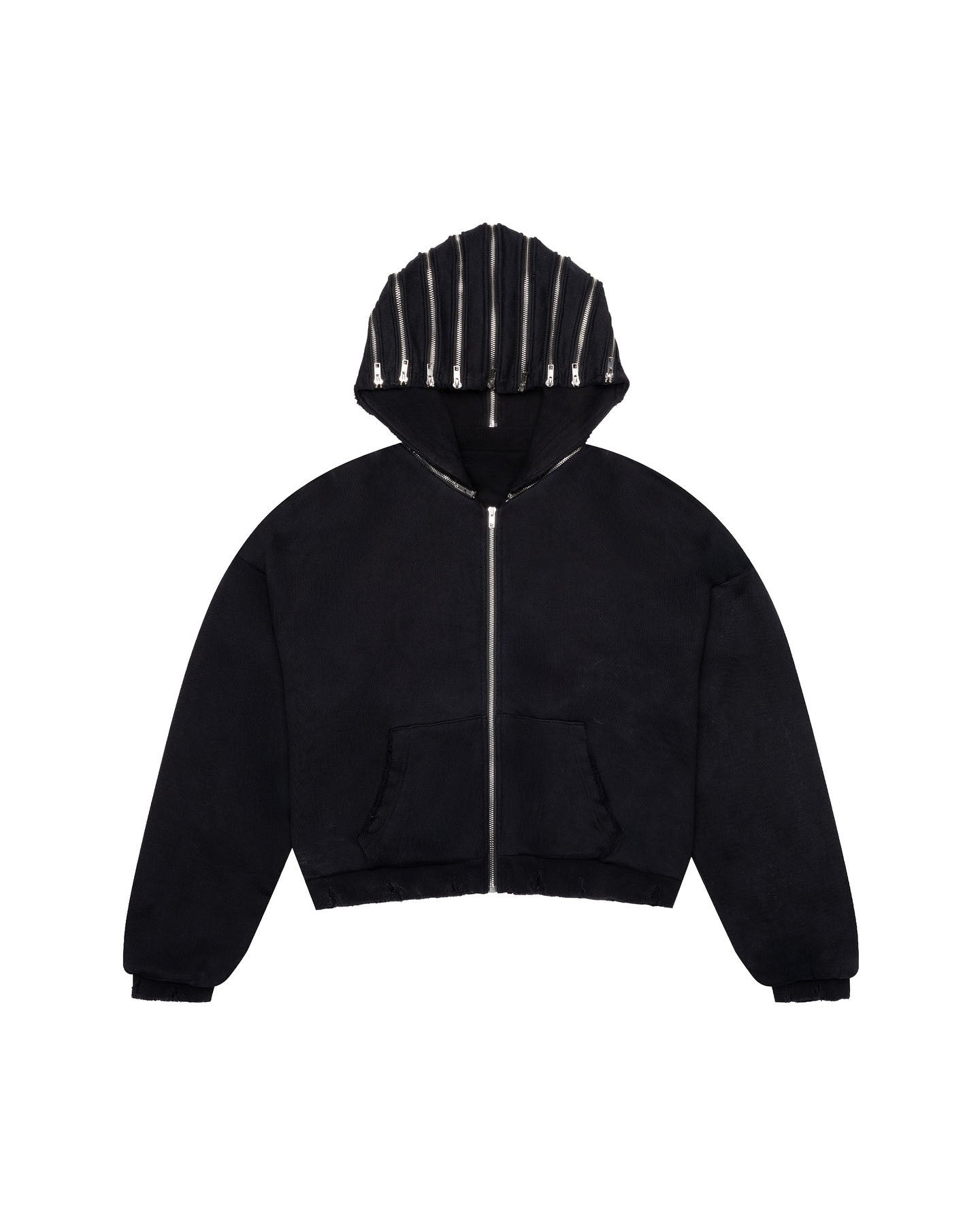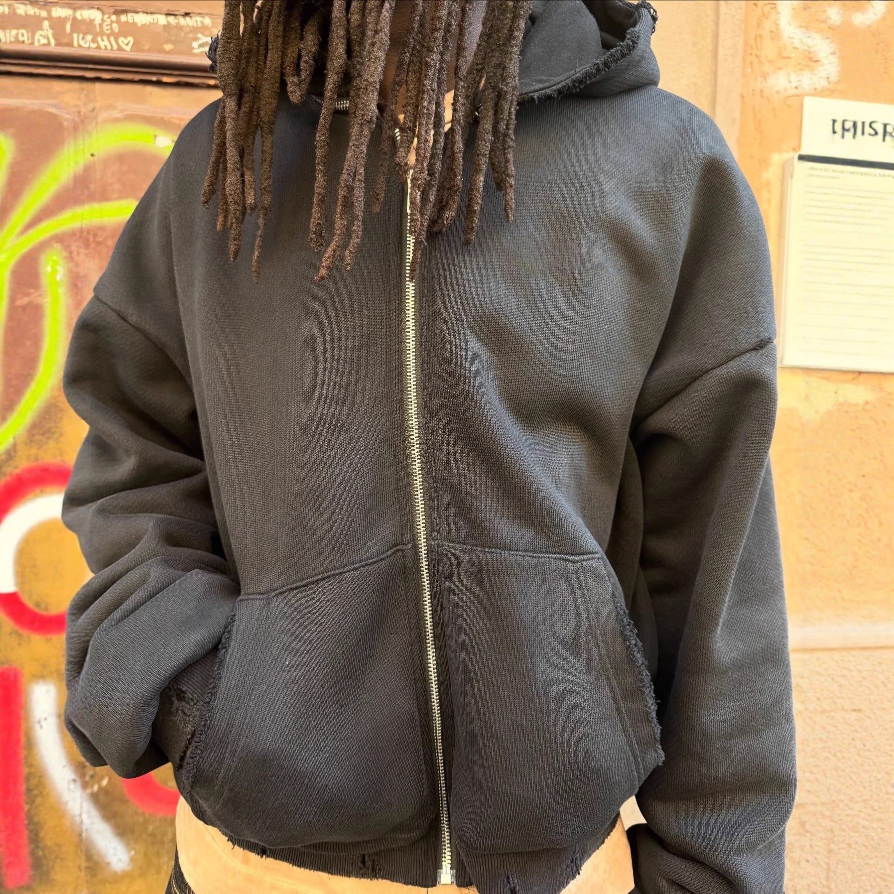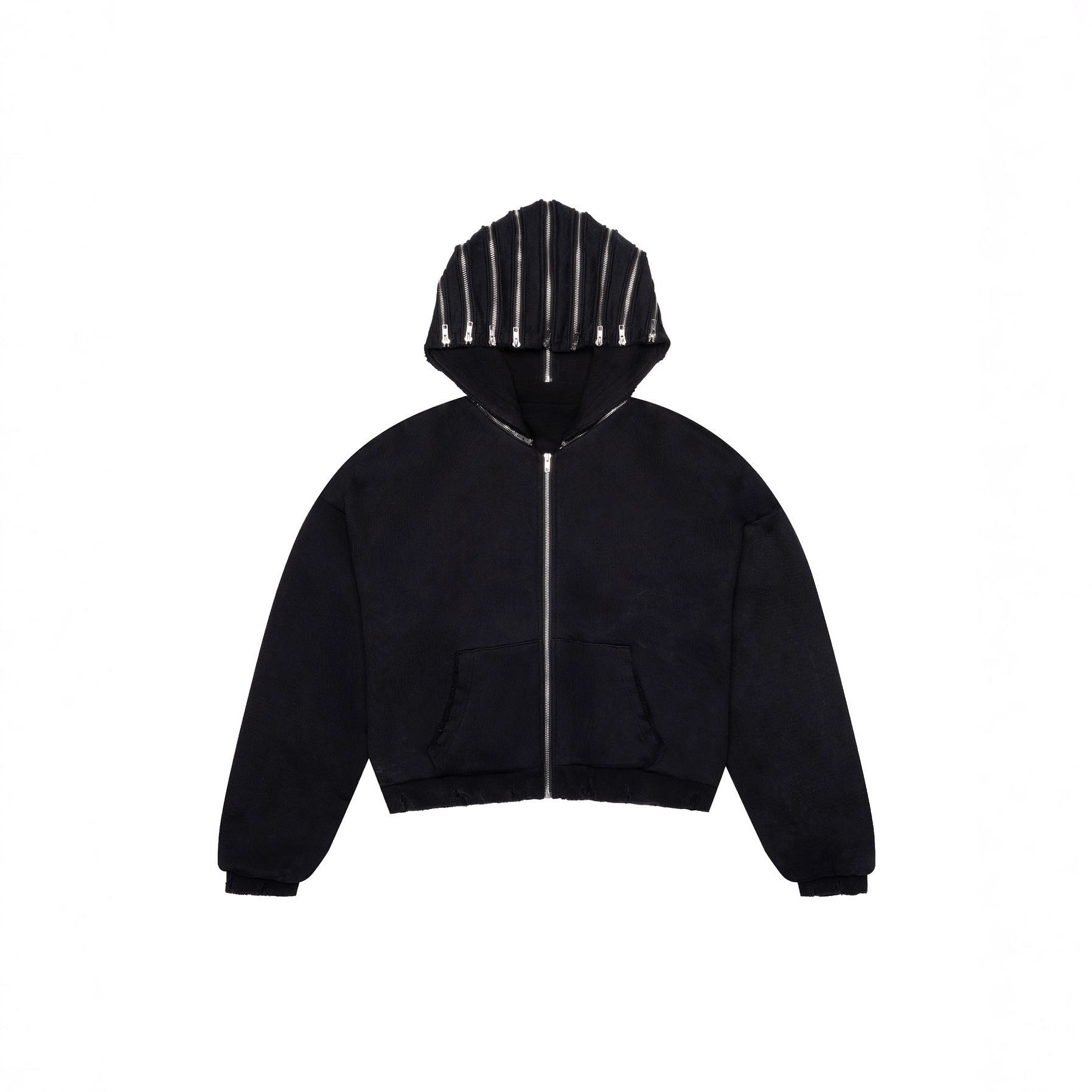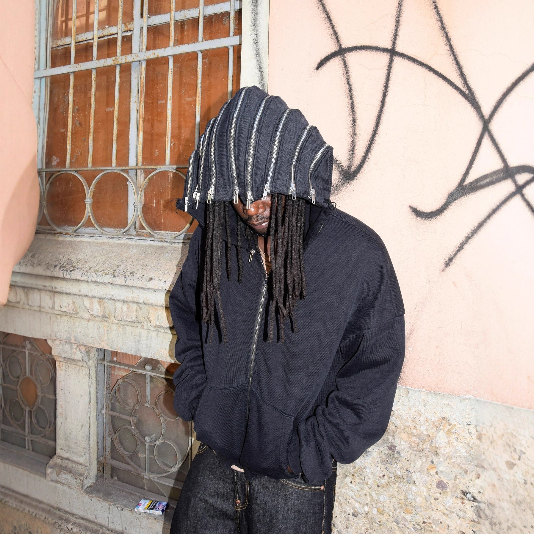 • Design: Mit einem aufwendigen, asymmetrischen Kapuzen-Design und einem stylischen Reißverschluss, der sowohl Funktion als auch visuelles Interesse bietet.
