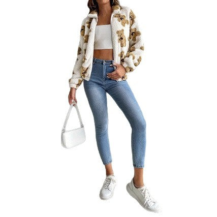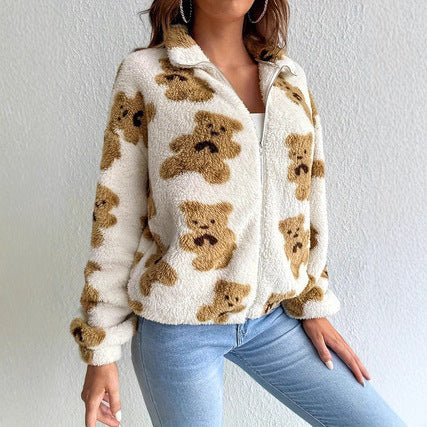 Damen kuschelige Fleecejacke mit Bärenmuster und durchgehendem Reißverschluss Fudus