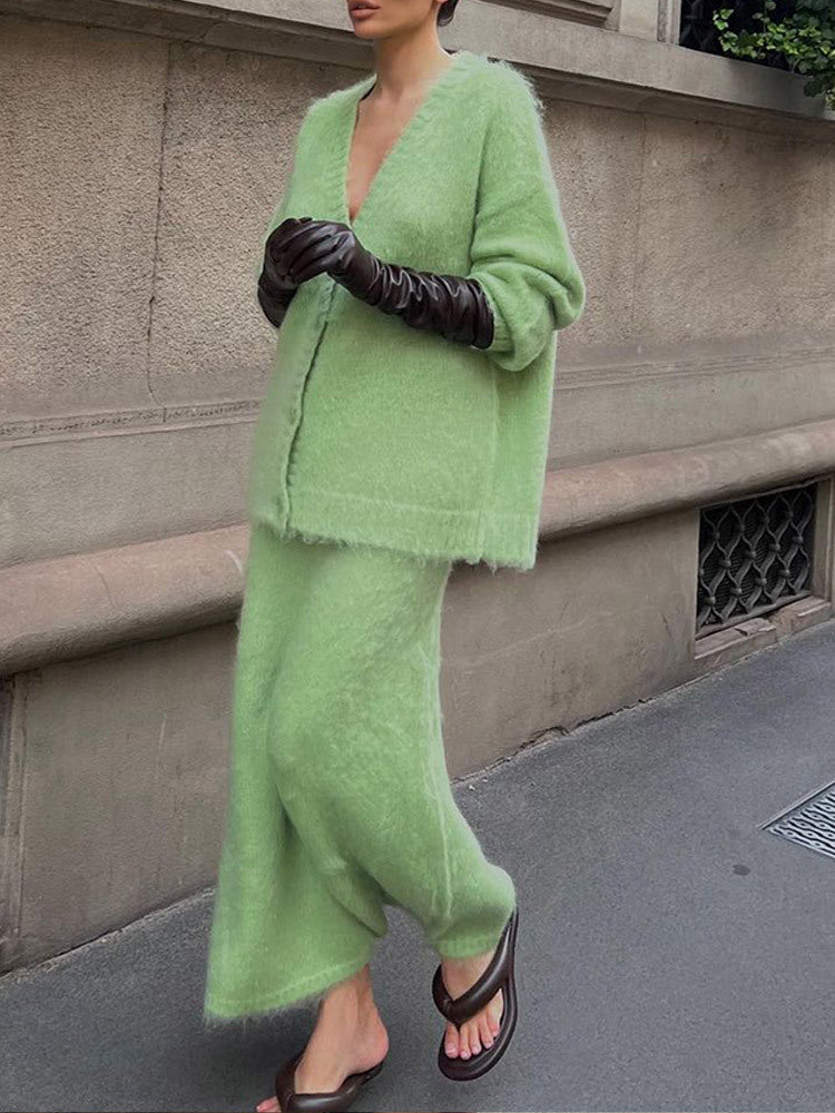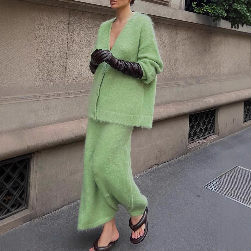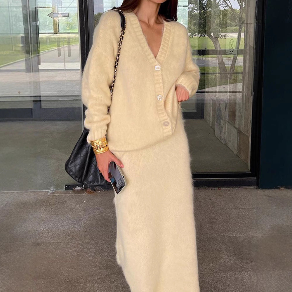 Damen kuschelige Strickjacke und Wadenlanger Rock Set Fudus