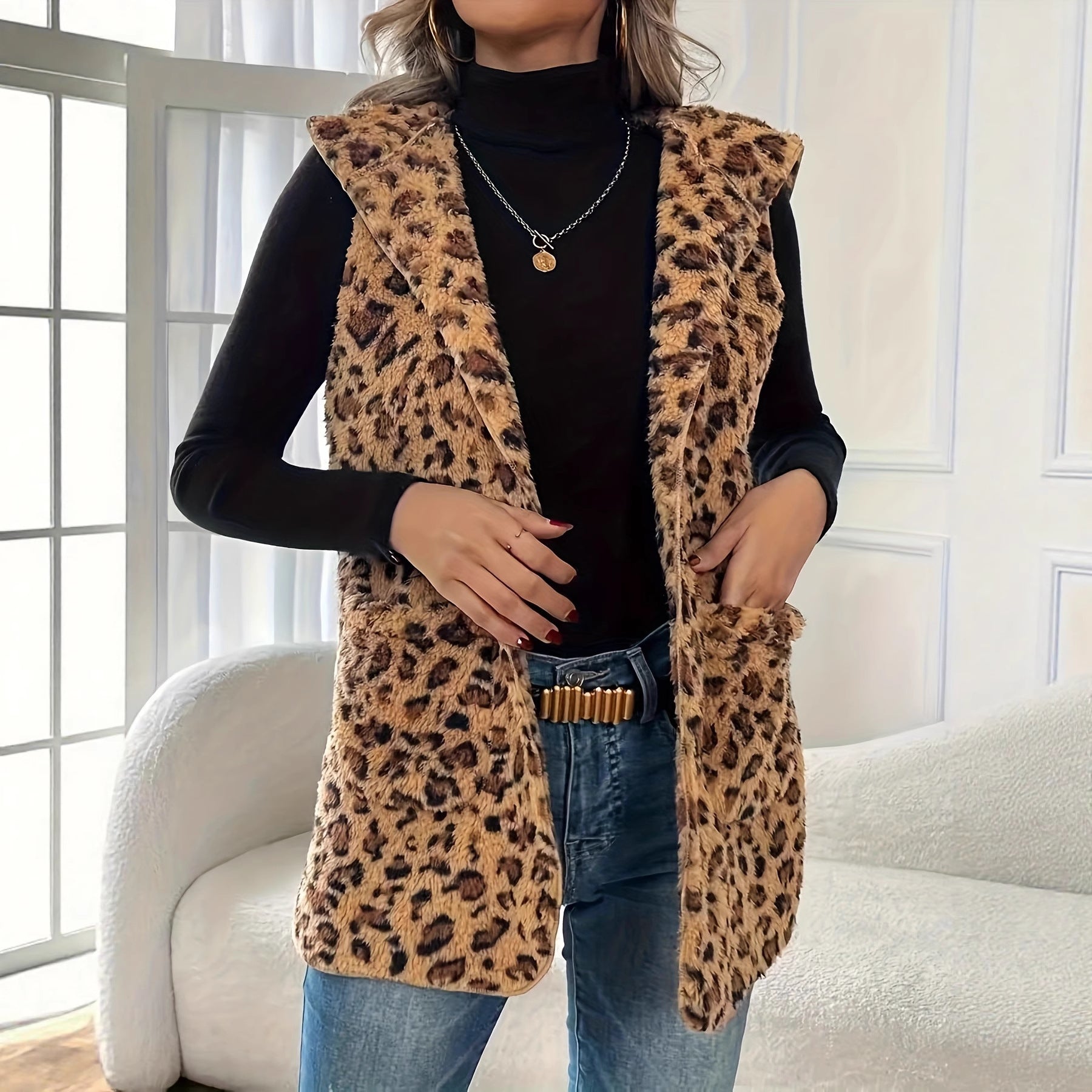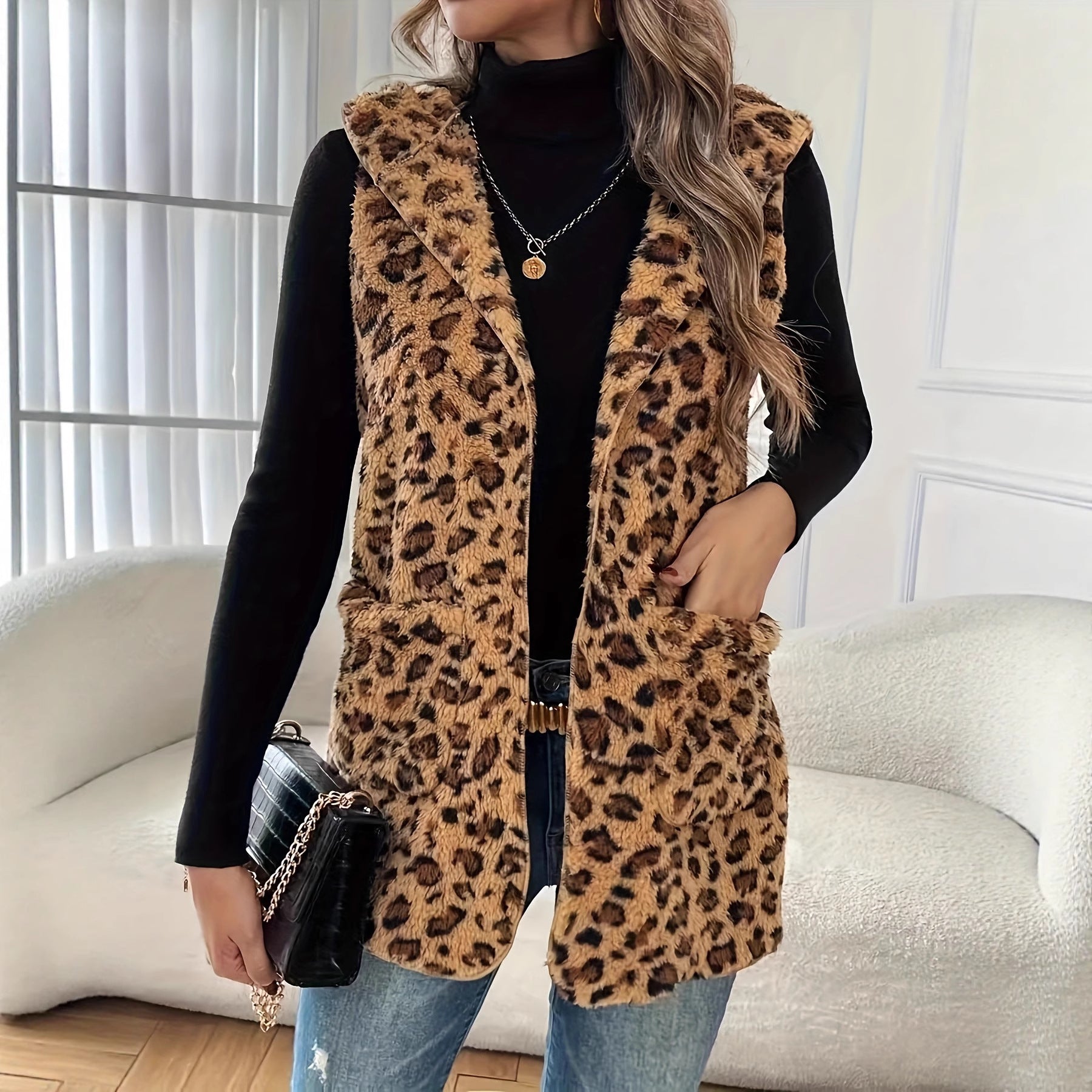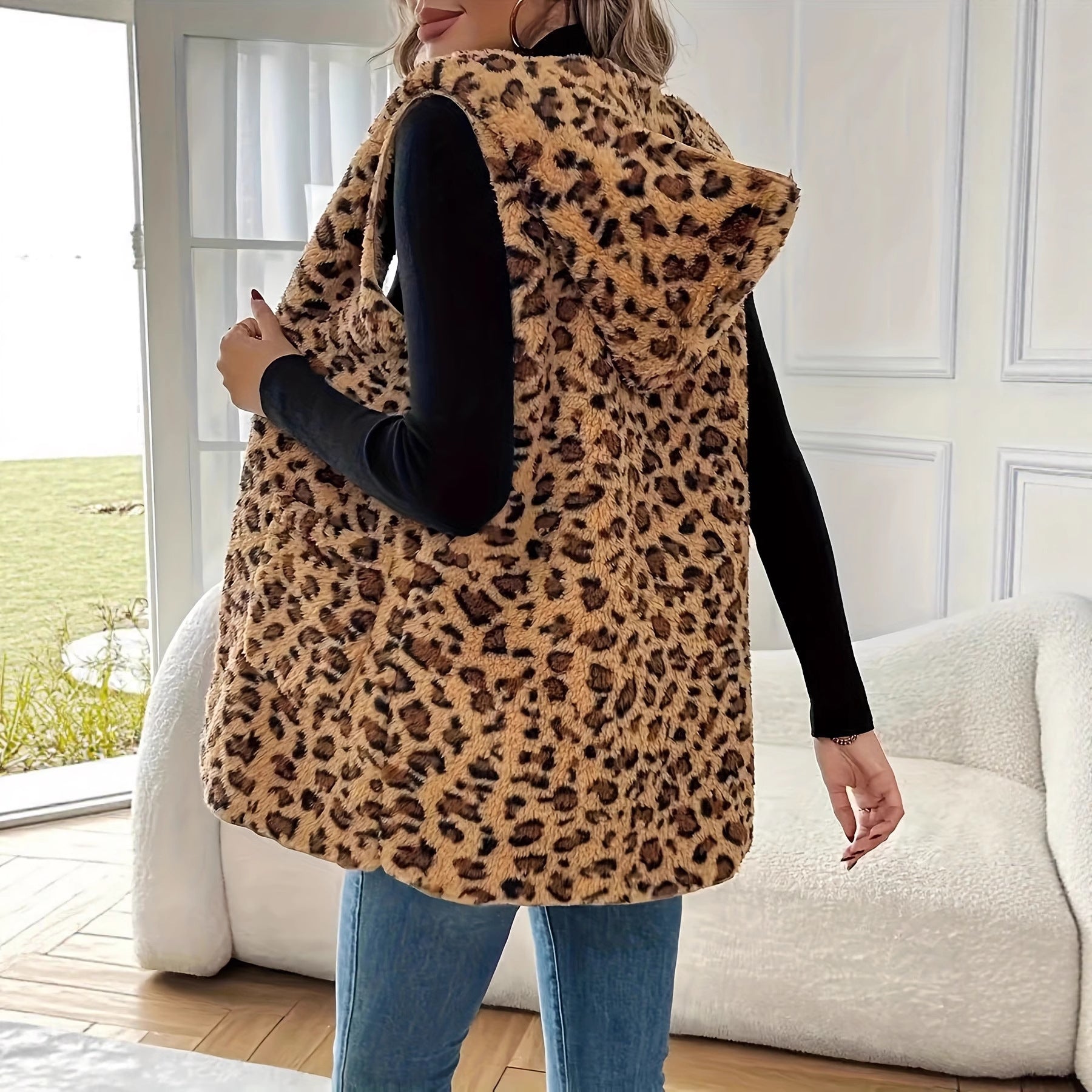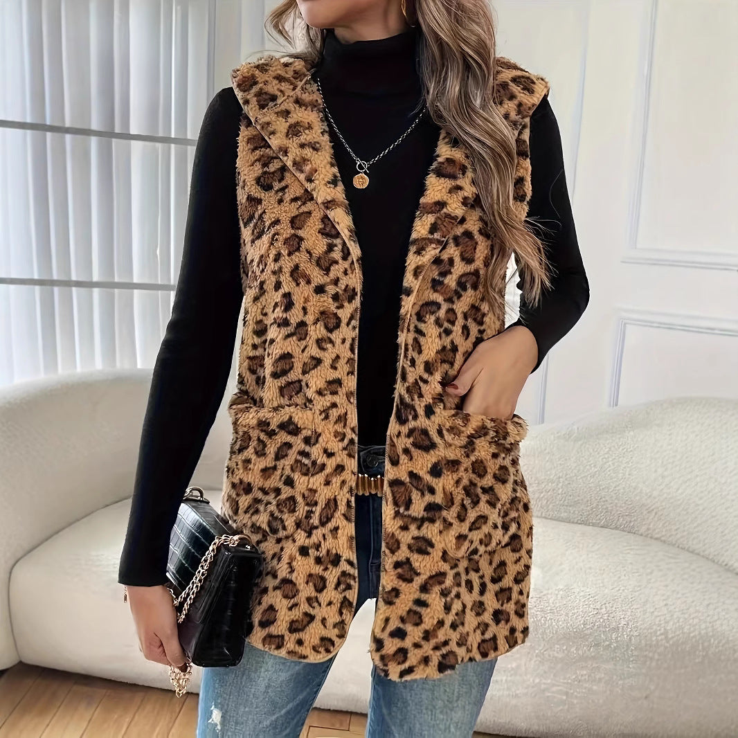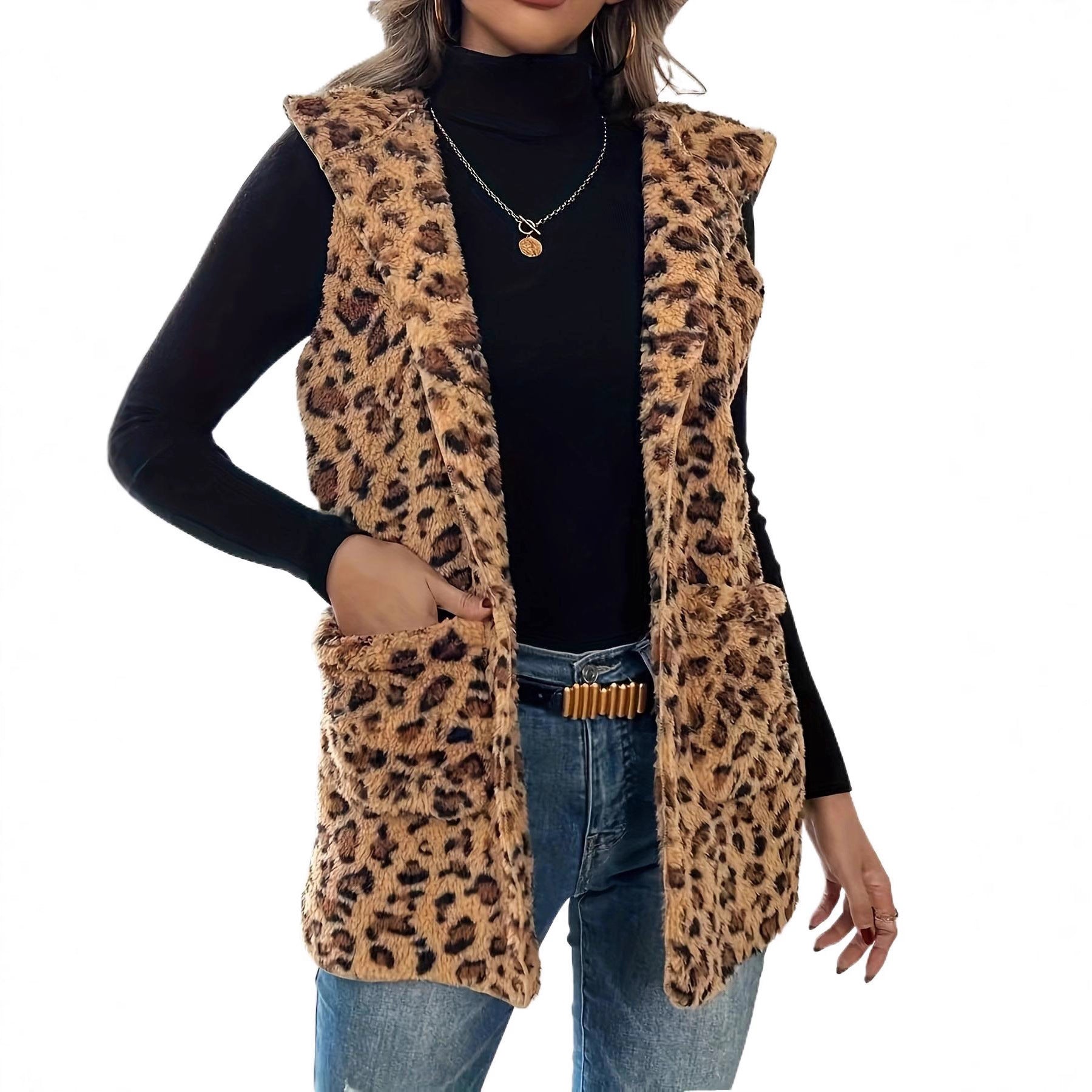Damen kuschelige Weste mit Kapuze und Leopardenmuster Fudus