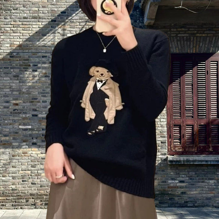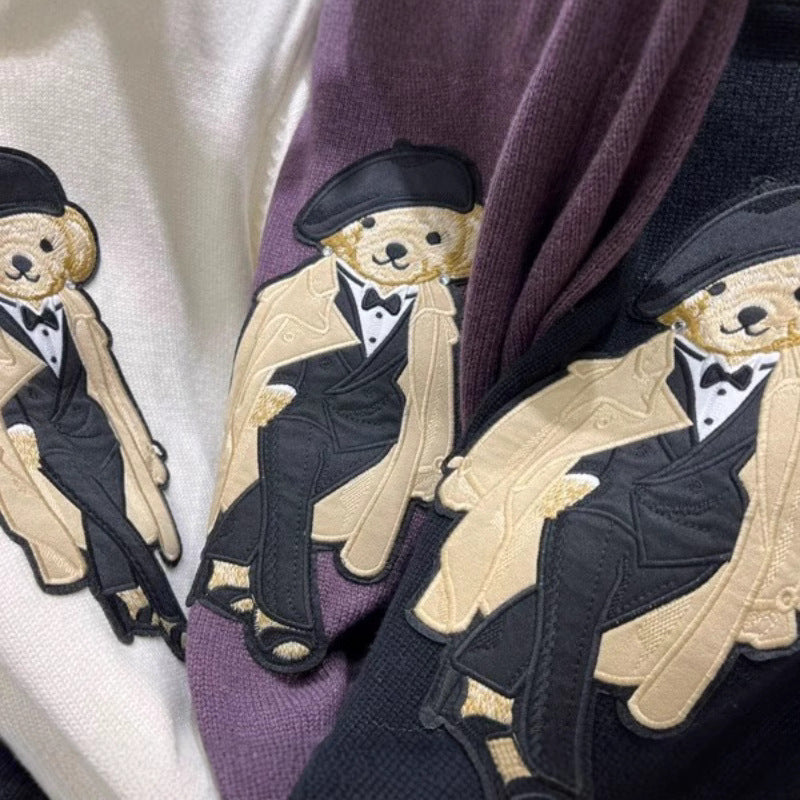 - Besonderes Design: Der Pullover ist mit einem charmanten Bären-Motiv verziert, das ihm einen spielerischen und gleichzeitig eleganten Look verleiht.
