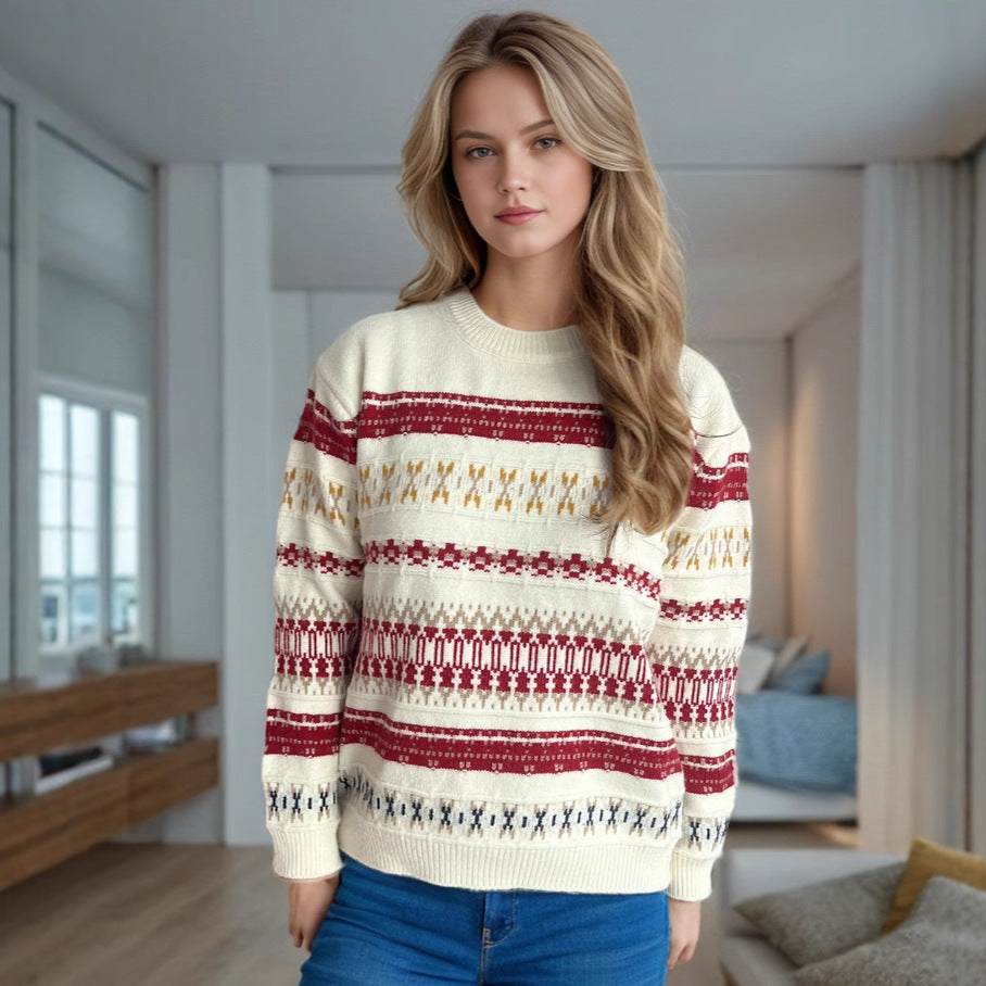 Damen Kuscheliger Strickpullover mit folkloristischem Muster und hohem Kragen Fudus