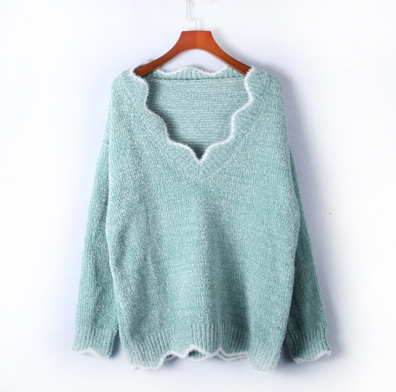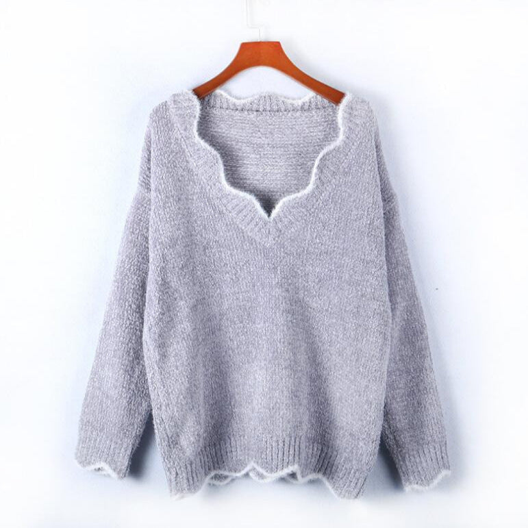 Damen kuscheliger Strickpullover mit tiefem V-Ausschnitt und gewellten Abschlüssen Fudus