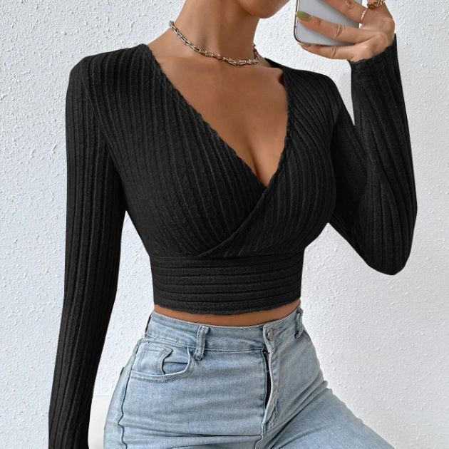 Damen Langarm-Crop-Top mit schmeichelndem Wickeldesign Fudus