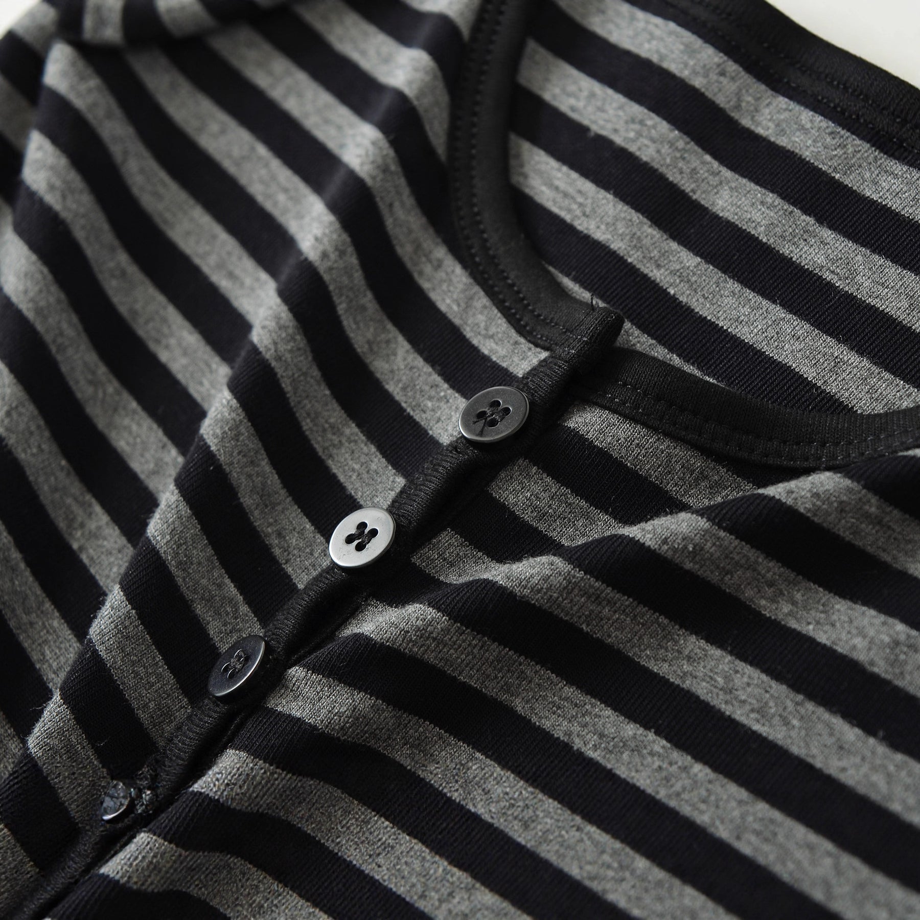 Die feinen, horizontalen Streifen verleihen dem Oberteil eine zeitlose Eleganz, während der Rundhalsausschnitt und die praktische Knopfleiste für einen modernen Akzent sorgen.
