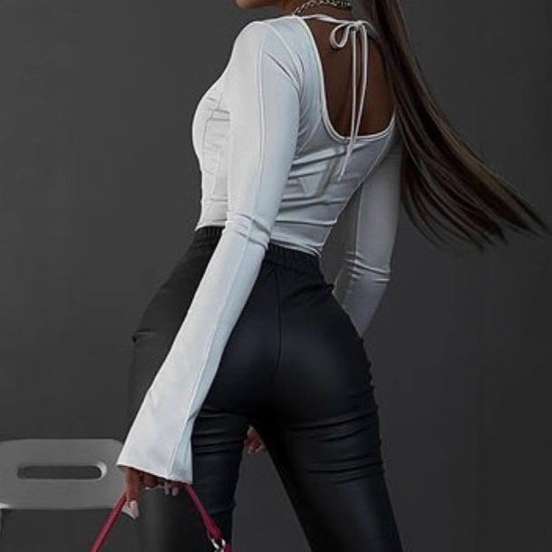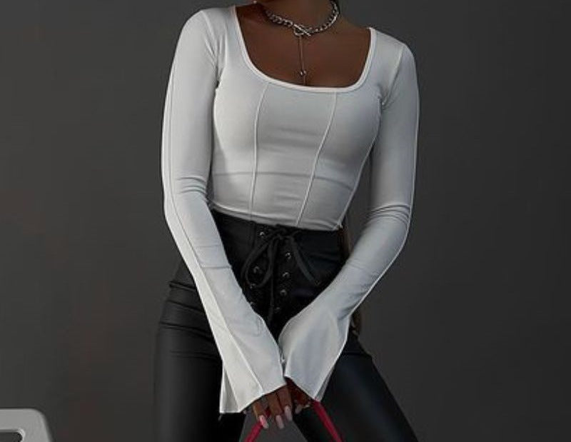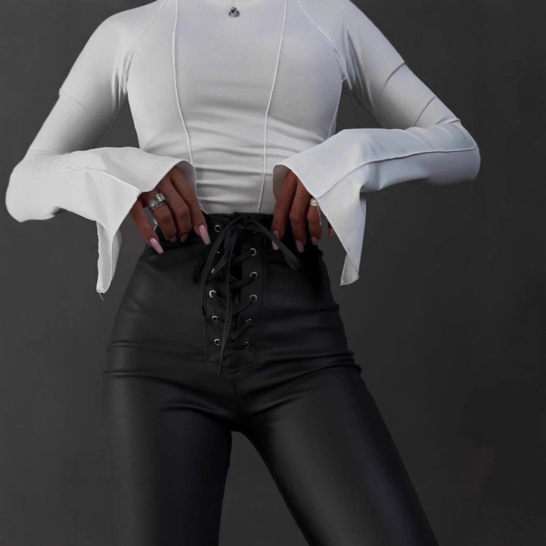 - Ärmel: Lange Ärmel mit auffälligen, weit auslaufenden Ends, die dem Oberteil einen besonders modischen Touch verleihen