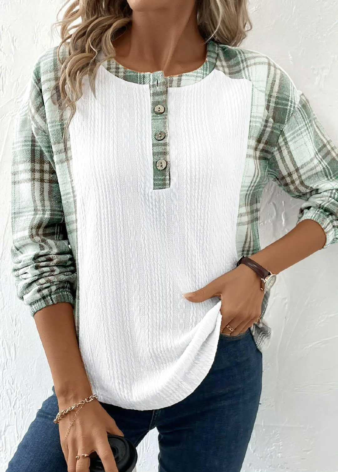 Entdecken Sie das stilvolle Damen Langarmshirt mit einem einzigartigen Karomuster und dekorativen Knopfdetails. Dieses Oberteil kombiniert Komfort und Trendbewusstsein.