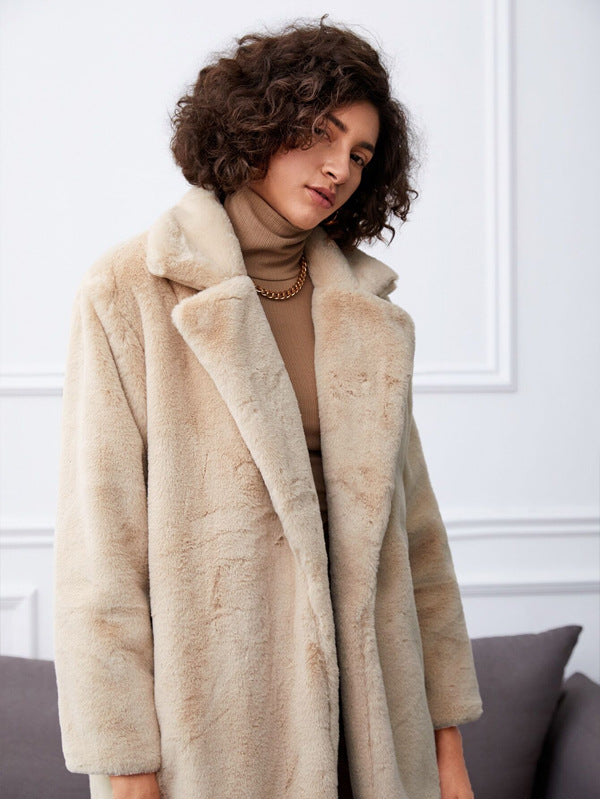 Damen Langer Kunstpelzmantel mit elegantem Reverskragen und praktischen Taschen Fudus